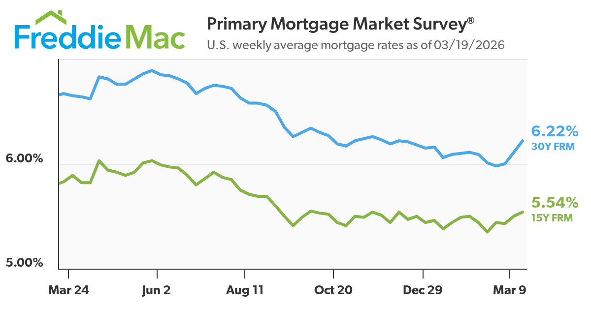 核心观点 - 房地美发布的2026年3月19日当周主要抵押贷款市场调查显示,30年期固定抵押贷款利率小幅上升至6.22%,但仍显著低于去年同期近0.5个百分点,首席经济学家认为春季购房季的可负担性将优于去年,市场已出现购房申请和待售房屋销售改善的迹象 [1][2][5] 抵押贷款利率数据 - **30年期固定抵押贷款(FRM)**:截至2026年3月19日当周平均利率为6.22%,较前一周的6.11%有所上升,但低于一年前同期的6.67% [1][5] - **15年期固定抵押贷款(FRM)**:截至2026年3月19日当周平均利率为5.54%,较前一周的5.50%小幅上升,低于一年前同期的5.83% [5] 市场与行业观察 - 房地美首席经济学家指出,尽管本周利率微升,但相比去年同期,利率水平降低了近半个百分点,这为潜在购房者带来了一个比去年更实惠的春季购房季节 [2] - 市场已出现积极信号,包括购房申请和待售房屋销售的改善 [2] 调查背景与公司信息 - 主要抵押贷款市场调查主要针对首付20%、信用优良的借款人的常规合格完全摊销购房贷款 [2] - 房地美的公司使命是在所有经济周期中促进住房市场的流动性、稳定性和可负担性,自1970年以来已帮助数千万家庭实现购房、租房或保有住房 [3]