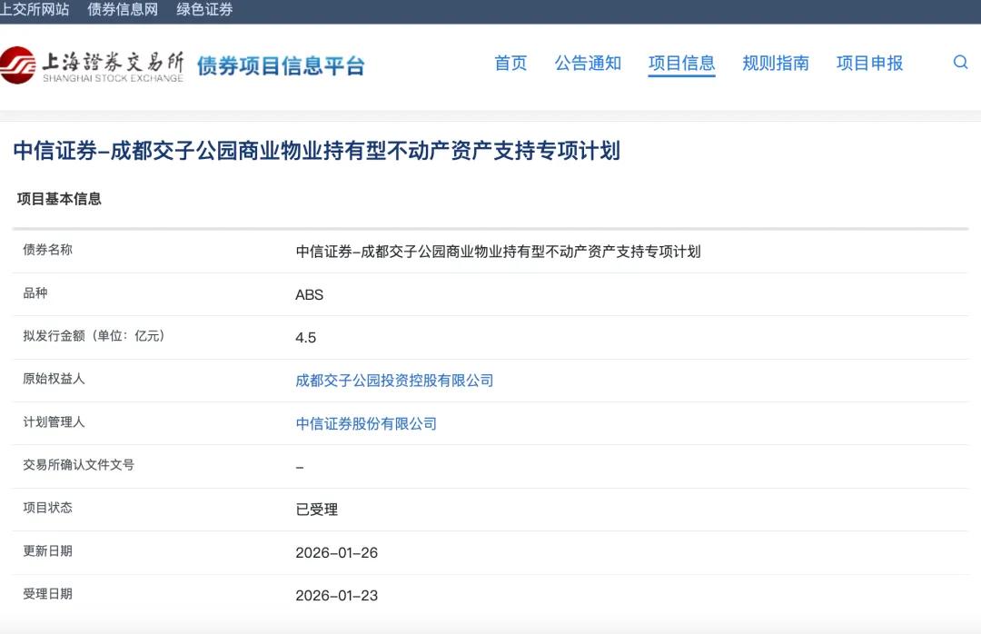 资产支持证券发行 - 中信证券作为计划管理人 已申报并获受理一项名为“中信证券-成都交子公园商业物业持有型不动产资产支持专项计划”的ABS产品 [2] - 该专项计划的原始权益人为成都交子公园投资控股有限公司 拟发行金额为4.5亿元 [2] - 该项目的状态为已受理 受理日期为2026年1月23日 更新日期为2026年1月26日 [2] 原始权益人背景与定位 - 原始权益人成都交子公园投资控股有限公司于2022年8月在成都高新区注册成立 是成都交子公园金融商务区的股权投资平台 [2] - 公司采用“基金+直投”双轮驱动模式 致力于打造西部股权投资基金发展高地 [2] - 公司紧密围绕片区规划发展理念 突出资本撬动作用 以持续培育经济增长新动能 [2] 投资策略与产业布局 - 公司围绕成都高新区电子信息、生物医药、数字经济等优势产业进行布局 [3] - 公司聚焦消费医疗、人工智能、低空经济、卫星通讯、生物科技、机器人等前沿科技赛道 并加大产业培育力度 [3] - 公司与LVMH、美团龙珠、同创伟业、鼎晖等知名机构合作设立了多支基金 [3] 基金体系建设 - 公司积极践行“一园区一基金”指引 围绕人工智能、卫星通信、机器人、新材料、大消费等行业推动双GP基金组建 [3] - 公司力争形成省市区三级联动的产业基金体系 [3]