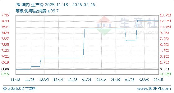 对二甲苯(PX)价格行情分析 - 2月20日生意社PX基准价为7650.00元/吨 [1] - 价格较本月初(7300.00元/吨)上涨4.79% [1] - 当日价格日涨幅为0.00% [3] PX价格历史与市场位置 - 当前价格处于一年内的高位 [3] - 过去一年的价格最小值为6600.00元/吨 [3] - 过去一年的价格最大值为7650.00元/吨,与当前价格持平 [3] - 过去一年的价格中位值为7125元/吨 [3] - 当前价格与过去一年最高值(顶位差)的差值为0 [3] - 当前价格与过去一年最低值(底位差)的差值为1050 [3] - 过去一年的价格平均值为7096.99元/吨 [3]