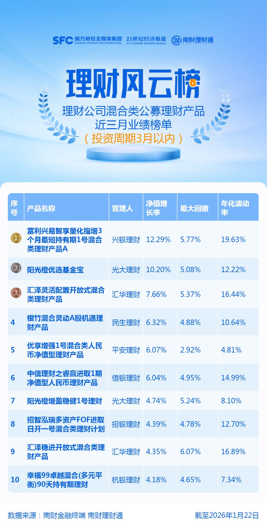 文章核心观点 - 文章基于南财理财通数据,发布了截至2026年1月22日理财公司3个月以内混合类公募理财产品的近三月业绩榜单,并对市场背景和上榜产品进行了分析 [1][4][6] - 2025年第四季度A股市场风格发生切换,资金从科技成长板块流向红利价值板块,影响了相关理财产品的资产配置与业绩表现 [5] - 在整体市场表现分化的背景下,少数产品凭借较高的权益仓位和有效的策略(如量化)取得了显著的超额收益,但多数同类产品近三月收益平平 [6][7] 市场表现 - 2025年第四季度,A股市场资金从算力、AI应用等科技板块流向分红稳定、现金流充裕的红利资产 [5] - 红利板块中,能源、银行、资源类标的涨幅居前,部分消费、传媒类红利股则表现承压 [5] 混合类公募产品整体表现 - 截至2026年1月22日,理财公司共存续329只投资周期为3月以内的公募混合类产品(含不同份额)[6] - 从近三个月业绩分布看,超过60%的产品净值增长率不足1%,约30%的产品净值增长率位于1%至4%的区间 [6] - 本期上榜产品来自多家理财公司,其中光大理财和汇华理财各有2只产品上榜,兴银理财、民生理财、平安理财、信银理财、招银理财及杭银理财各有1只产品上榜 [6] 榜单产品业绩详情 - **兴银理财**的“富利兴易智享量化指增3个月最短持有期1号混合”以12.29%的近三月净值增长率位居榜首,其最大回撤为5.77%,年化波动率为19.63% [2] - **光大理财**的“阳光橙优享高股息”净值增长率为10.20%,最大回撤5.08%,年化波动率12.22% [2] - **汇华理财**的“汇泽家居一类理财产品”净值增长率为7.66%,最大回撤5.37%,年化波动率16.44% [2] - **民生理财**的“银竹混合灵动A股机遇理财产品”净值增长率为6.32%,最大回撤4.88%,年化波动率10.64% [2] - **平安理财**的“优享增强1号混合类人民币净值型理财产品”净值增长率为6.07%,最大回撤2.92%,年化波动率4.81% [2] - **信银理财**的“信睿进取1期法人民币理财产品”净值增长率为6.04%,最大回撤4.95%,年化波动率14.99% [2] - **光大理财**另一产品“阳光橙增盈稳健1号理财”净值增长率为4.74%,最大回撤5.24%,年化波动率8.10% [3] - **招银理财**的“招智泓瑞多资产FOF进取1号”净值增长率为4.39%,最大回撤4.78%,年化波动率12.70% [3] - **汇华理财**另一产品“汇泽稳进开放式混合类理财产品”净值增长率为4.35%,最大回撤6.07%,年化波动率16.89% [3] - **杭银理财**的“幸福99卓越混合(多元平衡)90天持有期理财”净值增长率为4.18%,最大回撤4.65%,年化波动率7.34% [3] 领先产品深度分析 - 榜首产品**兴银理财富利兴易智享量化指增3个月最短持有期1号混合**为R4中高风险等级产品,截至2025年四季度末,其权益类资产持仓占比高达54.19% [7] - 该产品同时配置了公募基金(占比4.43%)和金融衍生品(占比1.60%)[7] - 产品通过多因子分散和行业均衡配置进行风险防控,并利用量化策略应对四季度市场风格从成长向红利价值切换的再平衡行情,实现了业绩稳健增长 [7]