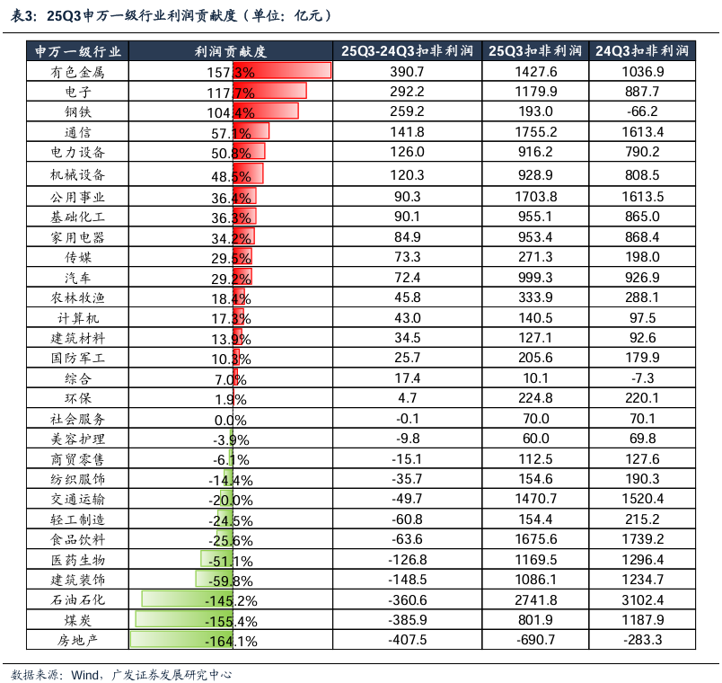 A股非金融整体盈利表现 - A股非金融25年三季报ROE(TTM)为6.56%,较25年中报的6.57%微降0.01个百分点,连续三个季度走平 [1][6][7] - 25年三季报累计营收同比增速为+0.31%,较中报的-0.56%转正,累计归母净利润同比增速为+1.65%,较中报的+0.89%提升 [4] - 25年第三季度非金融A股扣非利润同比增长1.2%,同比多增248亿元 [2] 杜邦分析拆解 - 销售利润率从25中报的4.09%提升至25三季报的4.12%,主因费用率回落 [6][7] - 资产周转率从25中报的58.04%下降至25三季报的57.87%,形成拖累 [6][7] - 毛利率从25一季报的17.64%微降至25三季报的17.54% [7] 宽基指数业绩比较 - 成长风格指数净利润增速改善显著,科创50指数净利润同比增速大幅回升16.4个百分点,创业50指数回升11.5个百分点,创业板指回升6.3个百分点 [1][9][10] - 大盘风格指数中,上证50净利润同比增速改善4.1个百分点,沪深300改善2.9个百分点 [1][9][10] - 小盘风格指数中,国证2000改善3.5个百分点,中证1000改善1.1个百分点 [1][9] 行业盈利贡献与表现 - 有色金属行业对25Q3利润贡献度最高,达157.3%,其扣非利润从24Q3的1036.9亿元增至25Q3的1427.6亿元 [2] - 电子行业利润贡献度为117.7%,钢铁行业为104.4%,通信行业为57.1%,电力设备为50.8% [2] - 房地产行业利润贡献度为-164.1%,煤炭行业为-155.4%,石油石化行业为-145.2%,对三季报业绩构成主要拖累 [2][11] 细分行业连续改善亮点 - TMT行业中,影视院线25年三季报盈利同比增速达111.0%,游戏为88.6%,软件开发为85.6% [12] - 中游制造领域,地面兵装盈利增速从25一季报的-109.5%大幅改善至三季报的38.6%,电池行业增速为34.4% [12] - 必需消费领域,动物保健盈利增速为97.9%,农产品加工为52.4% [12]