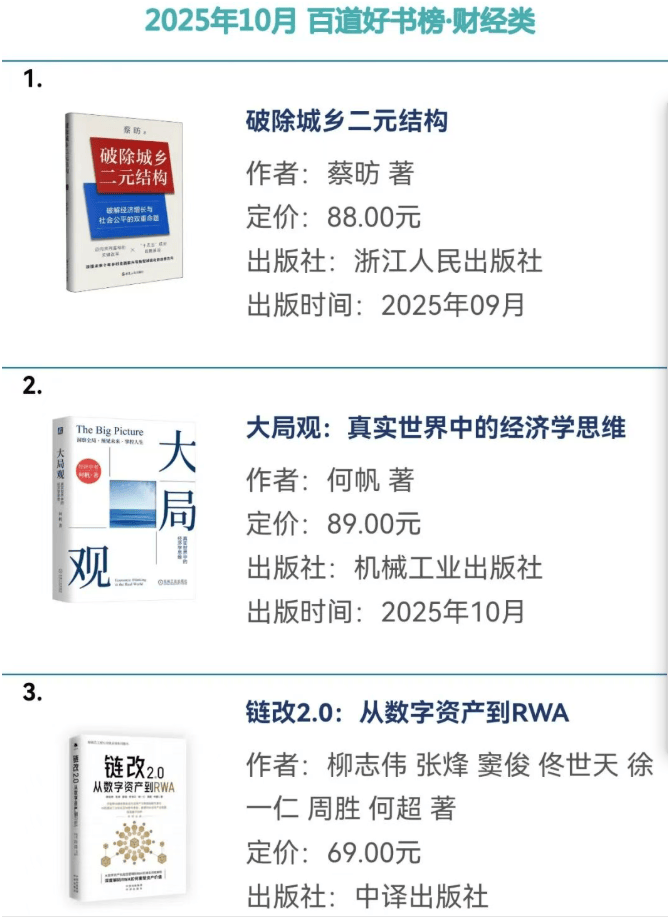 《链改2.0:从数字资产到RWA》荣登2025年10月百道好书榜财经类第三名