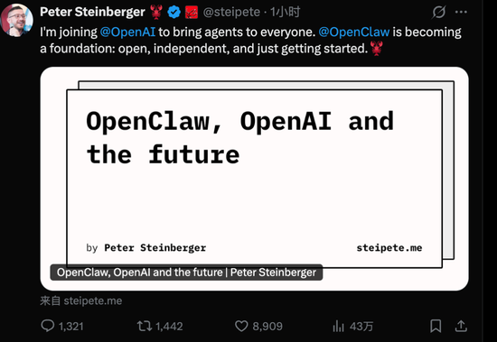 核心事件与人事变动 - OpenClaw项目创始人Peter Steinberger宣布加入OpenAI 致力于开发下一代个人助手智能体 [1][2][4] - 此次人事变动距离OpenClaw项目爆火仅过去一个月 进展迅速 [1] - OpenAI首席执行官Sam Altman在社交平台X上确认了此次人事任命 [2] OpenClaw项目现状与规划 - OpenClaw项目将转入一个开放且独立的基金会 继续保持开源和自由发展 [1][3][4][6] - 该项目自去年11月发布以来增长迅猛 GitHub星标数超过10万 单周访问量达200万 [9] - 项目创始人认为OpenAI是实现其个人智能体愿景并扩大影响力的最佳平台 [4][6] 项目创始人的动机与愿景 - 创始人加入OpenAI的核心动机是希望最快地将个人智能体愿景带给所有人 而非创建另一家大公司 [4][5] - 创始人强调其本质是创造者 目标是改变世界 并认为与OpenAI合作是实现此目标的最快途径 [5] - 创始人的下一个具体使命是打造一个连其母亲都能使用的智能体 [4] 行业趋势与影响 - 此次人事变动释放出OpenAI正在认真押注个人代理赛道的强烈信号 [9] - 行业主线正从2023年的Chatbot爆发 2024年的Copilot工具化 向2025-2026年的Agent自主执行演进 [9] - OpenClaw的加入可能意味着竞争进入新阶段 即从“会说话的AI”迈向“会替你做事的AI” [9] - OpenClaw主打“agentic AI” 被其粉丝视为能自动处理邮件、沟通、值机等多步骤线上任务的个人助理 [9] - 社交智能体已成为年度AI热词 预计未来将涌现更多瞄准此方向的创业公司 [9]
