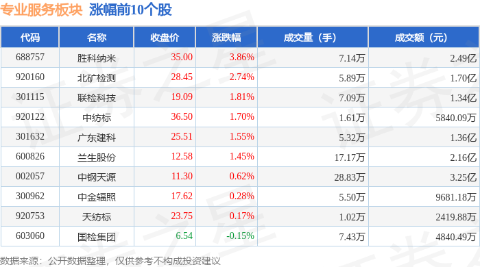 证券之星消息,1月22日专业服务板块较上一交易日上涨0.86%,科锐国际领涨。当日上证指数报收于 4122.58,上涨0.14%。深证成指报收于14327.05,上涨0.5%。专业服务板块个股涨跌见下表: | 代码 | 名称 | 收盘价 | 涨跌幅 | 成交量(手) | 成交额(元) | | --- | --- | --- | --- | --- | --- | | 300662 | 科院国际 | 30.81 | 7.09% | 15.01万 | 4.53亿 | | 688757 | 胜科纳米 | 32.80 | 6.70% | 8.29万 | 2.73亿 | | 920122 | 中纺标 | 36.73 | 5.27% | 2.87万 | 1.05亿 | | 300797 | 钢研纳克 | 18.75 | 4.05% | 13.88万 | 2.58亿 | | 300938 | 信测标准 | 31.04 | 3.99% | 12.37万 | 3.77亿 | | 300572 | 安车检测 | 29.50 | 3.98% | 9.83万 | 2.84亿 | | 301169 | 零点有数 | 64.59 | 2 ...