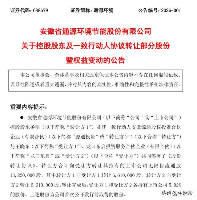 股权转让交易核心信息 - 安徽省通源环境节能股份有限公司控股股东杨明及其一致行动人安徽源通股权投资合伙企业(有限合伙)与王晓东、龙口东启投资服务合伙企业(有限合伙)签署《股份转让协议》[1] - 转让方合计向受让方转让上市公司无限售流通股13,220,000股,其中杨明向王晓东转让6,610,000股,安徽源通向龙口东启转让6,610,000股[1] - 转让完成后,王晓东和龙口东启投资服务合伙企业(有限合伙)各持有上市公司5.02%的股份[1] 受让方背景与关联关系 - 受让方王晓东的长期居住地为山东省龙口市通海路28号,与中际旭创实际控制人王伟修之子王晓东的地址一致[3] - 龙口东启投资服务合伙企业(有限合伙)的股东为方杰(40%)、冯小伟(40%)、王晓东(20%)[3] - 中际旭创董秘办确认,受让方王晓东确实是公司实际控制人王伟修之子,但该笔投资属于王晓东个人行为,与中际旭创公司层面无关[6] - 通源环境董秘办回应称,协议转让是公司实控人杨明和自然人王晓东之间的交易,目前来看后者属于战略投资者[6] 交易引发的市场反应 - 自发布公告以来,通源环境股价从1月9日收盘价27.7元/股上涨至1月23日收盘价54.65元/股[4] - 截至目前,公司股价累计涨幅已达111.74%[4] 中际旭创与其实际控制人背景 - 中际旭创股份有限公司是专业的高速光模块解决方案提供商,集研发、设计、封装、测试和销售于一体[6] - 公司2023年开始布局车载智能系统领域,并加强光电产业全链条投资布局[6] - 实际控制人王伟修于1987年创办企业,2012年带领公司在创业板上市,2016年主导以28亿元收购苏州旭创科技,推动公司转型光模块领域[8] - 公司产品涵盖800G、1.6T光模块,境外销售收入占比超85%,客户包括英伟达、谷歌等[10] - 王伟修、王晓东父子在《2024胡润百富榜》中财富为195亿元人民币,位列第247位;在《2025胡润百富榜》中财富飙升至680亿元人民币,位列第73位[10]