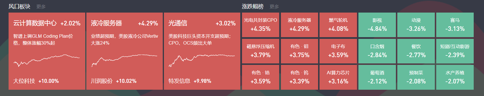 2月12日主题复盘 | 云计算、液冷等联手大涨,玻纤板块持续强势