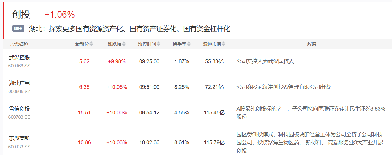 三、机构解读 1)央企分红"留存"效应明显,地方国资证券化比例提升空间更大。考虑国资委持股比例和上市公司宣告分红,2023-24上市央企分红远超中央国有资本经营 收入(不考虑非税部分)2倍多,可见一级央企集团层面"留存"效应明显。 一、行情 10月21undefined日undefined,undefined湖undefined北undefined本undefined地undefined股undefined、undefined国undefined企undefined改undefined革undefined迎 undefined来undefined集undefined体undefined走undefined强undefined。undefined湖北广电、汇绿生态、东湖高新、振华股份、武汉控股、石化机械、广济药 业、华建集团、交运股份、申达股份等集体涨停。 undefined创undefined投undefined公undefined司undefined中undefined,undefined鲁信创投涨停,中国高科等大涨。 | 创投 | +1.06% | | | | | | | | --- | --- | -- ...
