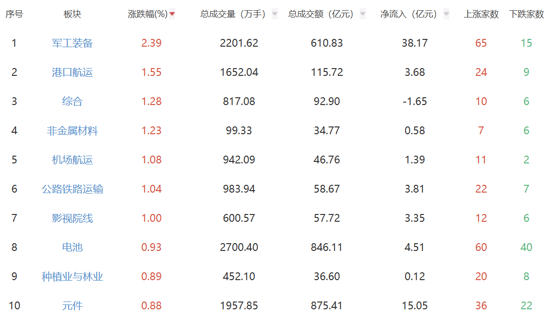 | 序号 | 板块 | 涨跌幅(%)▼ | | 总成交量 (万手) ▼ 总成交额 (亿元) ▼ | 浄流入(亿元)▼ | 上涨家数 | 下跌家 | | --- | --- | --- | --- | --- | --- | --- | --- | | 1 | 军工装备 | 2.39 | 2201.62 | 610.83 | 38.17 | ୧୮ | 15 | | 2 | 港口航运 | 1.55 | 1652.04 | 115.72 | 3.68 | 24 | ത | | 3 | 综合 | 1.28 | 817.08 | 92.90 | -1.65 | 10 | റ | | ব | 非金属材料 | 1.23 | 99.33 | 34.77 | 0.58 | 7 | ଚି | | 5 | 机场航运 | 1.08 | 942.09 | 46.76 | 1.39 | 11 | വ | | ଚ | 公路铁路运输 | 1.04 | 983.94 | 58.67 | 3.81 | 22 | 7 | | 7 | 影视院线 | 1.00 | 600.57 | 57.72 | 3.35 | 12 | ଚ | | 8 | 电池 | ...
