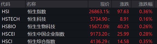 1月27日,香港恒生指数开盘涨0.36%,恒生科技指数涨0.16%。 | 代码 | 名称 | 现价 | 涨跌 | 涨跌幅 | | --- | --- | --- | --- | --- | | H2I | 恒生指数 | 26863.15c | 97.63 | 0.36% | | HSTECH | 恒生科技 | 5734.90 c | 8.91 | 0.16% | | HSBIO | 恒生生物科技 | 15672.09c | 40.25 | 0.26% | | HSCEI | 恒生中国企业指数 | 9173.20 c | 25.99 | 0.28% | | HSCI | 恒生综合指数 | 4136.29c | 1458 | 0.35% | 紫金矿业涨超4%。公司昨日晚间公告,1月26日,公司控股的紫金黄金国际有限公司与Allied Gold Corporation(简称 "联合黄金") 签署《安排协议》,紫金黄金国际拟以44加元/股的现金价格,收购联 合黄金全部已发行的普通股,收购对价共计约55亿加元(约合人民币280亿元)。 联合黄金核心资产包括在产的马里Sadiola金矿、科特迪瓦金矿综合体(含Bonikr ...