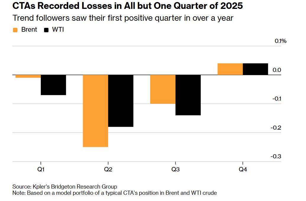 CTA行业在2025年面临的挑战与表现 - 2025年商品交易顾问遭遇史上最长的连续年度亏损,主要因关税、地缘政治动荡导致市场缺乏清晰方向性信号[1] - 2025年约80%的交易周里,CTA都在调整其美国原油持仓,持仓保持稳定的交易周较少且多集中在四季度[4] - 2025年大部分时间,受反复无常的贸易政策和中东冲突影响,CTA难以把握市场趋势,市场存在震荡价格区间、虚假突破和快速反转的信号[4] 2025年第四季度的短暂盈利与持仓变化 - 2025年末,市场对原油供应过剩的共识增强,为CTA提供了明确信号,使其难得实现了单季度盈利[4] - 年末的盈利势头推动CTA加大了对WTI原油近月合约的布局,这放大了市场波动率[4] - CTA在WTI原油近月合约日均成交量中的占比,在2025年仅为15%至25%[5] 2026年初的市场环境与策略调整 - 2026年1月以来,CTA的收益小幅为负,地缘政治波动再次带来挑战[5] - 本月初,CTA的持仓从净空转为净多,押注新一轮牛市趋势[5] - 普勒预计,到2026年,在油价大幅波动期间,CTA在WTI原油近月合约日均成交量中的占比将升至35%[5] 2025年不同交易品种的表现分化 - 2025年多数趋势跟踪基金表现惨淡,但部分系统化交易策略在布伦特原油远月合约中实现了盈利[6] - 布伦特原油相对WTI原油的走势优势,或源于后者更易与股票、金属等大类资产联动,使其趋势更难把握[6] - 成品油价差交易是2025年另一大盈利亮点,柴油跨月价差的大幅上涨推动2026年CTA在该合约的交易活跃度提升约56%[6] 行业策略演变与未来方向 - 部分交易员正升级交易模型,将重心转向今年表现远超能源板块的其他大宗商品[7] - 凯勒资本计划在本季度推出系统化金属交易项目,以分散投资组合并把握新机会[7] - 成品油价差合约的算法交易持仓规模预计将上涨约四分之一[6] - 与原油相比,成品油市场规模更小、交易更集中,价格走势可能被更显著地推动,但平仓也可能引发更剧烈的震荡[7]