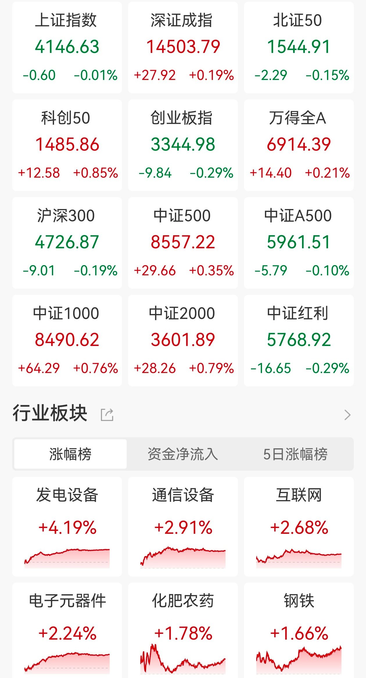 市场整体表现 - A股三大指数涨跌不一 沪指微跌0.01%收于4146.63点 深证成指上涨0.19%收于14503.79点 创业板指下跌0.29%收于3344.98点 [1] - 市场成交额显著放量 全天成交额达2.56万亿元 较前一交易日增加757亿元 [1] - 个股表现分化 全市场超2800只股票下跌 [1] - 主要宽基指数中 科创50指数表现强势 上涨0.85% 中证1000与中证2000指数分别上涨0.76%和0.79% 而沪深300指数下跌0.19% [1] 行业板块表现 - AI硬件产业链集体爆发 受英伟达业绩超预期驱动 CPO概念、铜缆高速连接及液冷服务器等板块走强 烽火通信、亨通光电、中天科技等多股涨停 [1] - 电子产业链相关板块活跃 PCB及电子元件板块走高 沪电股份等多股涨停 [1] - 新能源与高端制造板块表现突出 可控核聚变板块走强 东方电气等多股涨停 发电设备板块近5日涨幅达4.19% [1][2] - 部分周期及资源品板块上涨 化肥、风电及稀有金属板块涨幅居前 化肥农药板块近5日涨幅为2.24% [1][2] - 科技板块资金关注度高 通信设备与互联网板块近5日涨幅分别为2.689%和2.91% 电子元器件板块近5日上涨1.78% [2] - 传统产业板块表现疲软 房地产板块高开低走 华联控股下跌逾6% 影视传媒板块持续走低 博纳影业一度触及跌停 [1] - 部分消费及能源板块下跌 水产养殖、退税商店及石油石化等板块跌幅居前 [1] - 钢铁板块近期表现稳健 近5日涨幅为1.66% [2]