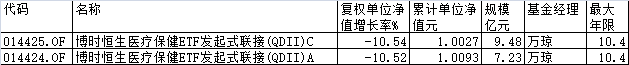 资料显示,该基金自2021年12月28日成立以来就一直由万琼管理至今,而在管理近4年后,其累计 收益率却仅有0.93%和0.27%,累计净值1.0093元、1.0027元。基金概况显示,该基金主要投资于ETF。 据悉,万琼2004年起先后在中企动力科技股份有限公司、华夏基金工作。2011年加入博时基金管理 有限公司,历任投资助理、基金经理助理、基金经理。万琼自2015年6月开始管理公募基金,至今已超 过10年。 中国经济网北京11月5日讯 今年10月份,博时恒生医疗保健ETF发起式联接(QDII)A/C分别下跌 10.52%和10.54%。 (责任编辑:康博) 来源:同花顺 | 代码 名称 | | 复权单位净 累计单位净 规模 基金经理 最大 | | | --- | --- | --- | --- | | | 值增长率% | 亿元 | 年限 | | 014425.0F 博时恒生医疗保健ETF发起式联接(QDII)C | -10.54 | 1.0027 9.48 万琼 | 10.4 | | 014424.0F 博时恒生医疗保健ETF发起式联接(QDII)A | -10. 52 | 1.0093 7.23 万琼 ...