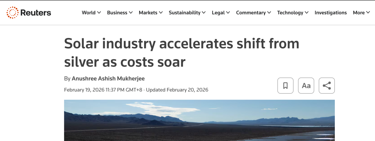 文章核心观点 - 白银价格飙升显著推高了太阳能电池板的制造成本,促使行业加速研发并转向铜等成本更低的替代金属以寻求降本 [2][3] 太阳能电池板成本与白银价格影响 - 过去12个月,太阳能电池板成本已上涨7%至15% [2] - 银浆作为关键材料,占太阳能电池总成本的30% [2] - 2025年白银价格上涨147%,并在1月份触及每盎司121.64美元的历史新高,随后回落至77美元 [2] - 在美国,每450瓦组件的银浆成本已从2025年初的约5.22美元增至约17.65美元 [2] 光伏行业白银需求与替代趋势 - 光伏行业白银需求量为1.96亿金衡盎司,占白银总需求量的17% [2] - 以白银每吨250万美元(约80.47美元/盎司)的价格计算,太阳能制造商正加速转向铜等替代品,铜的最新交易价为每吨12823美元(约0.41美元/盎司) [2] - 预计今年行业将出现更广泛的转变,领先制造商将转向纯铜金属化工艺和银铜混合浆料 [3] - 由于铜价约为白银价格的0.5%,这种转换带来的进一步降本潜力巨大 [3] - 以全球每年500吉瓦的太阳能产量计算,从白银转向铜基金属化工艺可为该行业每年节省约150亿美元 [3] 技术挑战 - 用铜替代白银并非易事,因为白银的导电率高于铜 [3]