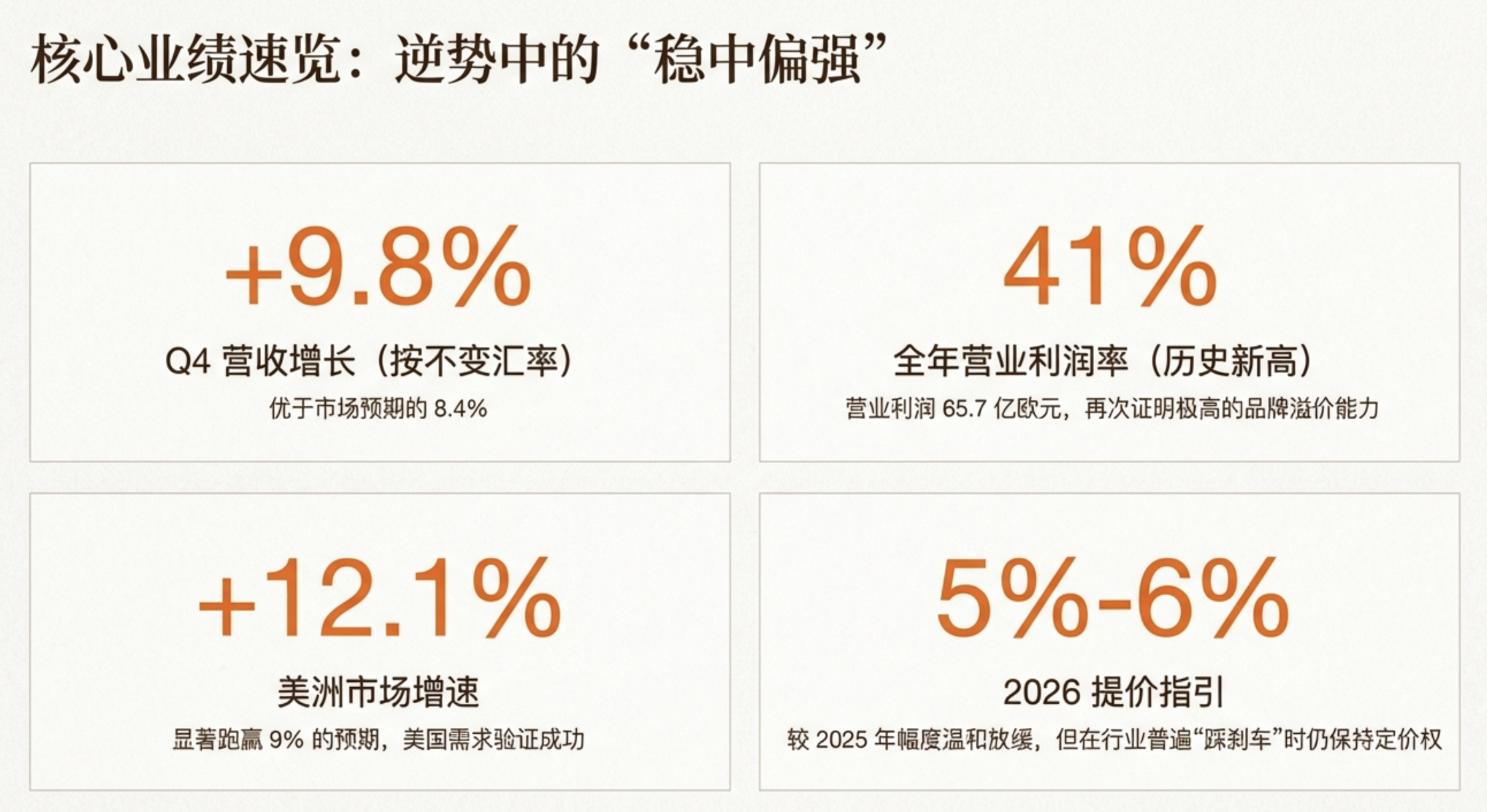 核心观点 - 在奢侈品行业整体需求走弱、同行普遍承压的背景下,爱马仕凭借其面向超高净值客群的独特定位、核心产品的稀缺供给以及强劲的品牌力,实现了“逆风稳跑”,2025年第四季度及全年业绩表现稳健且超出市场预期 [1][6] 财务表现 - 2025年第四季度营收按不变汇率计算增长9.8%,高于分析师一致预期的8.4% [1] - 2025年全年营业利润达65.7亿欧元(约合77.9亿美元),营业利润率为41%,小幅高于市场预期的40% [3] - 公司宣布将派发每股18欧元的股息 [3] 区域市场表现 - 美洲地区(主要为美国)成为最大亮点,第四季度销售按不变汇率计算增长12.1%,显著超出市场预期的约9%增速 [3][7] - 日本市场需求同样强劲,继续支撑集团在全球的韧性增长 [3][7] 产品部门表现 - 作为主要利润来源的皮具与马具部门(涵盖Birkin、Kelly等核心品类)第四季度有机增长14.6%,显著快于集团整体增速 [3][10] - 该部门的表现验证了其“稀缺供给+强品牌力”商业模式在行业放缓周期中的防御性 [3][10] 行业对比与商业模式 - 在开云集团旗下Gucci等品牌销售额下滑的行业背景下,爱马仕的稳健增长凸显其商业模式的韧性 [6] - 公司受益于对通胀与宏观波动敏感度更低的超高净值客群以及较长的订单积压,抗压能力显著强于多数奢侈品牌 [1][6] - 其以工艺壁垒和产能控制为特征的顶奢皮具,在需求走弱时比依赖Logo与潮流驱动的品类更能守住增长与利润率 [10] 定价策略与未来展望 - 管理层预计2026年产品提价幅度为5%-6%,较2025年的6%-7%有所放缓,部分原因归结为汇率变化 [3][13] - 尽管提价节奏放缓,但公司仍维持相对明确的年度提价规划,反映了对客户承受力与品牌溢价的信心 [13] - 市场未来关注焦点包括:美洲高增长能否延续、5%-6%提价在不同地区与品类的落地效果、以及公司如何平衡扩产与稀缺性管理以维持长期定价权 [14]