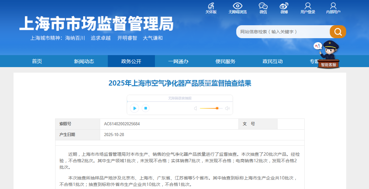 | 上海市市场监督管理局 | | | | --- | --- | --- | | 上海城市精神:海纳百川 追求卓越 开明睿智 大气谦和 | | 网站信息检索(输入关键字) | | 首页 | 新闻动态 | 一网通办 政民互动 政务公开 便民服务 | | 2025年上海市空气净化器产品质量监督抽查结果 | | | | 大厦候语言播报 | | | | 索取号 | | AC61402002025684 文 号 | | 产生日期 | | 2025-10-28 | | 近期,上海市市场监督管理局对本市生产、销售的空气净化器产品质量进行了监管抽查。本次抽查了20批次产品。经检 | 批次。 | 验,不合格2批次。其中生产领域1批次,未发现不合格:实体销售7批次,未发现不合格;电商销售12批次,发现不合格2 | | 不合格1批次;抽查到标称外省市生产企业共10批次,不合格1批次。 | | 本次抽查所抽样品产地涉及北京市、上海市、广东省、江苏省等5个省市。其中抽查到标称上海市生产企业共10批次、 | 中国质量新闻网讯 近日,2025年上海市空气净化器产品质量监督抽查结果公布。 附原文: 2025年上海市空气净化器产品质量监督抽查 ...