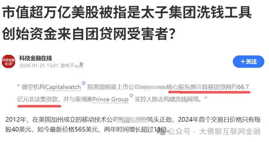 做空报告核心指控 - 某做空机构指控一家热门美股上市公司与电诈集团太子集团创始人陈志存在关联 其最大个人股东唐H和唐L可能与已判刑的团贷网实控人唐军有关联 [1] - 指控唐军在团贷网资金链断裂前(约2018年初至2019年初)将部分资金转移给唐H和唐L 直接转移约9000万美元 间接关联资金约9.6亿美元 合计约合67亿元人民币 [1] - 该部分被转移资金据称成为唐氏兄妹的启动资金 用于投资一家主营广告营销的美股上市公司 该公司股价近年飙涨 总市值已超过万亿人民币 [3] - 数据显示唐氏兄妹巅峰期直接和间接持股比例约12% 为公司最大的个人股东 [3] 涉嫌的洗钱与业务闭环 - 做空机构调查称唐H与太子集团陈志联系密切 双方为合作关系 [3] - 太子集团通过“杀猪盘”获得的资金 通过向该广告公司投放巨额广告费的方式进行洗白 同时广告投放提升了集团知名度 形成“圈钱”与“洗钱”的闭环 [3] - 美国于2025年10月打击太子集团 以电诈和洗钱罪名没收陈志12.7万枚比特币 按当时价格计算市值超千亿人民币 创美国司法部最大没收记录 [3] - 随后多地冻结太子集团资产 陈志于2026年1月初被抓并已被引渡 [3] 团贷网案件背景与进展 - 团贷网已被立案 实控人唐军被判刑20年 平台累计未兑付金额为348亿元人民币 [3] - 团贷网案已进行两次退赔 累计回款比例约为四成 [3] - 核对登记系统开放时间已更新为每月1日至3日 供未登记或需修改信息的投资人操作 [4] - 市场预期团贷网进行第三次退赔是大概率事件 但需等待归集更多资金 [4] 做空机构诉求与市场影响 - 做空机构建议美国监管冻结唐氏兄妹在该美股公司的持股份额 但尚未有官方回应 [4] - 若转移资金指控属实且资金能追回 团贷网投资人可能获得更多赔付 [4] - 报告信息源于国内媒体对做空机构报告的转载 做空机构目的性强 旨在通过负面信息冲击股价获利 部分数据真实性有待证实 事件仍处于传闻阶段 [4]