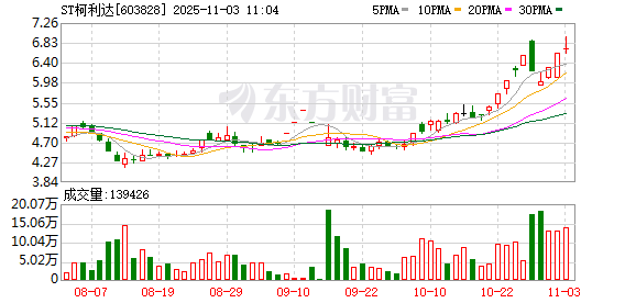 ST柯利达再度涨停,9个交易日内录得6个涨停,累计涨幅为27.29%,累计换手率为17.35%。截至 9:46,该股今日成交量762.32万股,成交金额5197.33万元,换手率1.28%。最新A股总市值达41.42亿 元,A股流通市值41.42亿元。 公司发布的三季报数据显示,前三季公司共实现营业收入11.89亿元,同比下降30.48%,实现净利 润-9884.87万元,同比下降683.61%,基本每股收益为-0.1700元。 据天眼查APP显示,苏州柯利达装饰股份有限公司成立于2000年08月28日,注册资本59596.0158万人民 币。(数据宝) 近日该股表现 | 日期 | 当日涨跌幅(%) | 换手率(%) | 主力资金净流入(万元) | | --- | --- | --- | --- | | 2025.10.31 | 5.08 | 2.20 | 789.32 | | 2025.10.30 | 5.00 | 2.19 | 44.07 | | 2025.10.29 | -3.54 | 3.04 | -1005.79 | | 2025.10.28 | -5.04 | 2.89 | -1178.67 |  ...