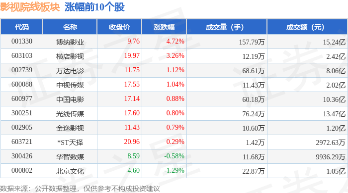 从资金流向上来看,当日影视院线板块主力资金净流入9308.77万元,游资资金净流出1.96亿元,散户资 金净流入1.03亿元。影视院线板块个股资金流向见下表: 证券之星消息,1月23日影视院线板块较上一交易日上涨1.8%,华谊兄弟领涨。当日上证指数报收于 4136.16,上涨0.33%。深证成指报收于14439.66,上涨0.79%。影视院线板块个股涨跌见下表: | 代码 | 名称 | 收盘价 | 涨跌幅 | 成交量(手) | 成交额(元) | | | --- | --- | --- | --- | --- | --- | --- | | 300027 | 华谊兄弟 | 2.29 | 3.15% | 105.96万 | | 2.40亿 | | 300426 | 华智数媒 | 8.64 | 3.10% | 12.27万 | | 1.05亿 | | 001330 | 博纳影业 | 9.32 | 2.76% | 146.87万 | | 13.64亿 | | 300133 | 华等影视 | 9.11 | 2.71% | 112.17万 | | 10.20亿 | | 000892 | 欢瑞世纪 | 8.38 | 2.7 ...