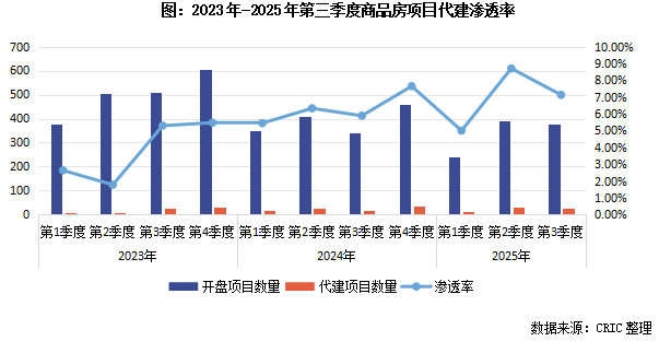 智通财经APP获悉,克而瑞地产研究11月3日发文称,代建项目在商品房项目中的渗透率持续攀升, 2025年前三季度,重点城市的代建渗透率已达到7.23%,较2024年增长了0.8个百分点。然而,各线城市 的发展态势各异,仅二线城市的代建渗透率保持上升趋势,而一线和三四线城市的渗透率则出现了一定 程度的下降。从拓展情况来看,2025年前三季度,头部代建企业的扩张意愿尤为强烈,拓展规模显著增 加,预计未来市场渗透率仍将保持上升趋势。 代建渗透率持达7.23%再创新高 二线城市代建项目占八成 随着重点监测城市开盘商品房项目的增多,代建项目的渗透率也呈现出明显的提升趋势。2025年前三季 度,代建渗透率已达7.23%,超越了2024年的水平。 分季度来看,第一季度渗透率为5%,同比下降0.44个百分点;第二季度渗透率跃升至8.7%,同比上升 2.37个百分点,并创下单季度新高;第三季度渗透率为7.12%,同比上升1.24个百分点。 总体而言,2025年各季度渗透率的走势虽与2024年相似,但波动幅度更大,呈现出集中入市的态势。若 第四季度能继续保持同比上升的趋势,全年渗透率有望再创新高。 从2025年新开盘的代建项目分 ...