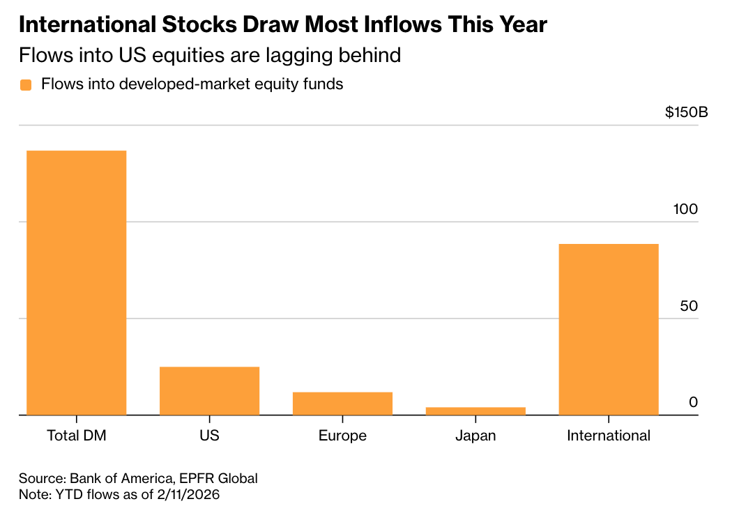 美国贸易政策与全球资产配置转向 - 美国贸易政策正在创造一个“新世界秩序”,投资者正从美元和美国股票转向非美资产,美国例外主义正转变为全球再平衡 [1] - 特朗普政府“让经济过热”的政策意味着新的“除了美元之外的一切”交易 [1] - 自特朗普去年4月宣布历史性关税措施以来,美国资产持续动荡,引发对美国在全球经济和金融市场主导地位终结的担忧 [4] 资金流向与市场表现 - 今年流入欧洲、日本及其他国际发达市场股票基金的资金合计达1040亿美元,远高于流入美国股票基金的250亿美元 [1] - 自2024年底以来,标普500指数上涨15%,但落后于MSCI全球指数(除美国外)39%的涨幅 [4] - 2026年以来欧股、日股、韩股、新兴市场指数集体跑赢美股,机构纷纷降低美股集中度,转向估值更低的全球市场 [4] - 1月投资者向国际股票交易所交易基金净流入516亿美元,自2024年底以来月度资金流入量大幅跃升 [4] 美元走软与投资吸引力 - 衡量美元表现的指标自2024年底以来已下跌10% [4] - 美元较2022年高点下跌约10%,提升了海外企业盈利的相对价值,从而推高了海外股票的回报率 [4] - 美元走软是海外市场投资吸引力上升的重要推手,叠加美元走软提振了海外回报 [4] 投资者配置策略变化 - 投资者对中国和印度的配置仍然不足 [1] - 新兴市场的大宗商品生产国有望受益于人工智能需求的增长 [1] - 投资者对美股的“单一执念”正在拓宽,更多客户询问为何不多配置一些海外公司股票,可能重新信奉国际多元化配置信条 [5] - 多数机构仍认为美股将继续引领全球股市走高,但领先优势不会像近几年那么巨大 [5] 市场内部轮动与机会 - 在人工智能投资热潮推动美股连续三年大幅上涨后,交易者开始在其他地方寻找下一波上涨机会 [5] - 受益的不只是海外股市,美股小盘股和蓝筹股近期也跑赢了主要基准指数 [5] - 有充分证据表明,不一定非要抛售美国,但应该开始减持美股、进行再平衡,采取更均衡的配置方式 [5]