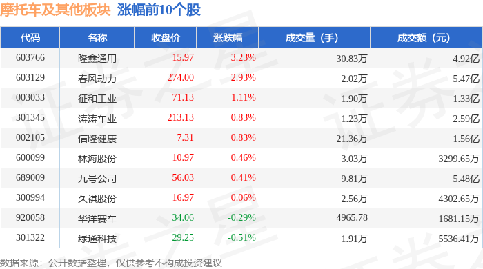 | 代码 | 名称 | 收盘价 | 涨跌幅 | 成交量(手) | 成交额(元) | | | --- | --- | --- | --- | --- | --- | --- | | 603766 | 降替通用 | 15.97 | 3.23% | 30.83万 | | 4.92 乙 | | 603129 | 春风动力 | 274.00 | 2.93% | 2.02万 | | · 5.47 Z | | 003033 | 征和工业 | 71.13 | 1.11% | 1.90万 | | 1.33亿 | | 301345 | 涛涛车业 | 213.13 | 0.83% | 1.23万 | | 2.59亿 | | 002105 | 信隆健康 | 7.31 | 0.83% | 21.36万 | | 1.56亿 | | 6000099 | 林海股份 | 10.97 | 0.46% | 3.03万 | | 3299.65万 | | 60006899 | 九号公司 | 56.03 | 0.41% | 9.81万 | | 5.48亿 | | 300994 | 久祺股份 | 16.97 | 0.06% | 2.56万 | | 430 ...