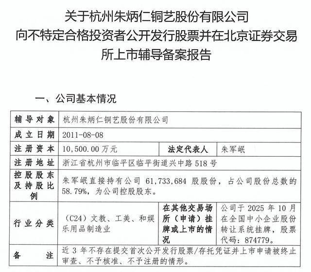 公司基本情况 - 公司全称为杭州朱炳仁铜艺股份有限公司,成立于2011年8月8日,注册资本为10,500.00万元 [1] - 公司注册地址位于浙江省杭州市临平区,法定代表人为朱军岷 [1] - 公司所属行业为文教、工美、体育和娱乐用品制造业 [1] - 公司已于2025年10月在全国中小企业股份转让系统挂牌,股票代码为874779 [1] - 公司近3年不存在IPO申请被终止审查、不予核准或不予注册的情形 [1] 本次IPO辅导安排 - 公司已启动IPO辅导,辅导协议签署时间为2025年10月15日 [2] - 本次IPO的辅导机构为浙商证券股份有限公司 [1][2] - 本次IPO的律师事务所为北京市君合律师事务所 [1][2] - 本次IPO的会计师事务所为中汇会计师事务所(特殊普通合伙) [1][2] 主营业务与品牌 - 公司主要从事铜工艺相关产品的研发、生产与销售,主要产品包括铜工艺品和铜装饰产品 [2] - 公司开创了“朱炳仁·铜”品牌,实际控制人朱军岷是国家级非遗铜雕技艺传承人及浙江省工艺美术大师 [2] - 公司顾问朱炳仁(朱军岷之父)是铜雕领域的国家级工艺美术大师、国家级非遗铜雕技艺传承人,并担任北京故宫博物院文创顾问等职务 [2] - 公司在传承传统技术基础上,开创了熔铜艺术与庚彩艺术 [2] 股权结构与实际控制人 - 控股股东及实际控制人为朱军岷,直接持有公司61,733,684股股份,占总股本的58.79% [1][5] - 朱嫣红直接持有公司20,062,454股股份,占总股本的19.11%,朱军岷与朱嫣红为兄妹关系 [5] - 朱军岷与朱嫣红还通过持有杭州军燕的全部合伙份额间接持有公司2,100,000股股份,占总股本的2% [5] - 朱军岷与朱嫣红共同控制公司79.90%的股份,为公司的共同实际控制人 [5] 管理层背景 - 朱军岷,55岁,担任公司董事长,拥有深厚的行业背景,自1990年起长期在铜艺相关企业任职 [7] - 朱军岷现任浙江省政协委员及杭州市工商联企业家协会副主席 [7] - 朱嫣红,51岁,担任公司董事,并长期担任浙江朱炳仁铜雕艺术博物馆馆长 [7] 财务表现:盈利能力 - 2023年至2024年,公司营业收入从4.85亿元增长至6.20亿元,同比增长27.9% [3][4] - 2023年至2024年,公司归母净利润从5,619.74万元增长至6,297.03万元,同比增长12.1% [3][4] - 2023年至2024年,公司毛利率从49.59%提升至53.77% [4] - 2023年至2024年,公司基本每股收益从0.54元/股增长至0.60元/股 [4] - 2024年公司扣除非经常性损益后的归母净利润为5,320.25万元 [4] 财务表现:资产与负债 - 2023年至2024年,公司总资产从74,135.73万元增长至96,519.00万元 [4] - 2023年至2024年,公司股东权益合计从44,829.97万元增长至51,073.95万元 [4] - 2023年至2024年,公司归属于申请挂牌公司的股东权益从43,841.30万元增长至50,085.49万元 [4] - 2023年至2024年,公司每股净资产从4.18元增长至4.77元 [4] - 2023年至2024年,公司资产负债率从39.53%上升至47.08% [4] 财务表现:运营效率与现金流 - 2023年至2024年,公司流动比率从1.83倍下降至1.60倍,速动比率从1.11倍下降至0.93倍 [4] - 2023年至2024年,公司应收账款周转率从3.09次提升至3.33次 [4] - 2023年至2024年,公司存货周转率从1.34次微降至1.28次 [4] - 2023年至2024年,公司经营活动产生的现金流量净额从5,944.15万元大幅增长至9,261.84万元 [4] - 2023年至2024年,公司加权平均净资产收益率(扣非)从12.07%降至11.30% [4]