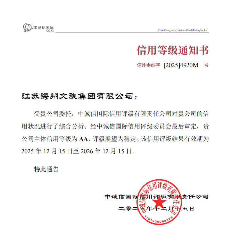 近日,江苏海州文旅集团有限公司经权威信用评级机构中诚信国际信用评级有限公司综合评定,正式斩获AA主 体信用评级,评级展望为稳定,有效期自2025年12月15日至2026年12月15日。 作为连云港市海州区文旅产业发展的核心载体,海州文旅集团今年以来立足区域优质文旅资源禀赋,紧扣全区 发展大局,聚焦主责主业提质增效,深入推进改革转型,持续提升企业营运能力与发展质效,充分发挥了国企 在区域发展中的核心支柱作用。此次AA信用评级的获批,既是专业机构对集团综合实力、战略规划及发展潜力 的高度认可,更是集团深化国企改革、实现高质量发展的重要成果彰显。 今年以来,海州文旅集团打破空间限制,通过业态创新与场景再造,因地制宜打造了主题市集、亲子游乐、咖 啡轻食、非遗手作等多元非标商旅体验空间,全面激活旅游消费潜力。引入"呦呦鹿鸣"亲子萌宠场景,推出夜游 孔望山项目,在山顶喝咖啡、听民谣、逛市集,全面激活夜游经济。发展首发经济,发布了《天书奇境》VR体 验及《迷雾审判》互动影视游戏两大数字文旅项目,以科技赋能"活化"万年岩画。招引了霸王茶姬、7-Eleven等 潮流品牌,打造了海州往事、镜花绮梦等沉浸式剧本游,推出了朐秀、汉服 ...