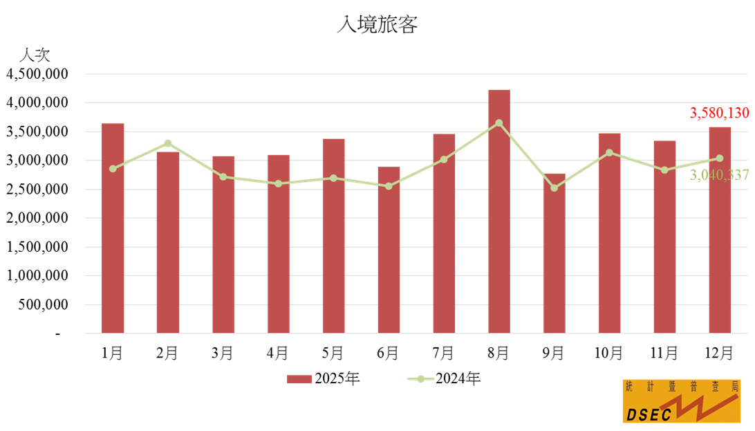 南方财经21世纪经济报道记者田静澳门报道 1月23日,澳门特区统计暨普查局公布数据显示,澳门2025年全年入境旅客达40,069,360人次,较去年同期上升14.7%,反映旅游业持续复苏。 2025年国际访澳旅客共2,755,474人次,同比增长13.7%。东南亚市场中,泰国旅客增幅显著,达38.1%,菲律宾、印尼及马来西亚亦分别有9.5%至13.6%的 增长。东北亚的日本及韩国旅客分别上升26.1%及11.3%。美国旅客则增长9.8%,南亚的印度旅客亦增加9.8%。 在入境渠道方面,全年经陆路入境旅客达33,084,253人次,占总数的82.6%,按年上升19.1%。其中,经关闸及横琴口岸的旅客分别增长23.5%及42%。海路 及空路入境旅客则分别减少3.9%及0.5%。 单计2025年12月,入境旅客共3,580,130人次,按年上升17.8%,不过夜及留宿旅客分别增加23%及10.9%。当月旅客平均逗留时间为0.9日,同比减少0.2日, 主要因留宿旅客平均逗留时间缩短所致。 综合全年数据,澳门旅游业在内地尤其大湾区客源带动下呈现稳健增长,不过夜旅客比例上升及短途化趋势明显,为旅游及相关行业带来持续动力。 ...