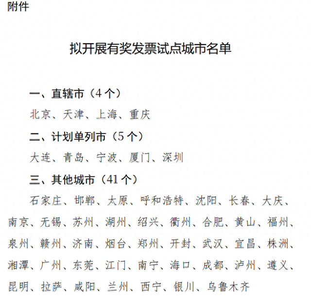 据介绍,试点城市对个人消费者以本人名义向零售、餐饮、住宿、文化艺术、娱乐、旅游、体育、居民 服务业等行业的经营主体购买商品和服务,且取得的票面金额在一定额度以上的发票组织抽奖。中央财 政将对试点城市分档安排奖补资金。 三部门有关负责人此前表示,此次出台的有奖发票试点政策着重从需求端发力,鼓励居民消费并取得发 票后参与抽奖。试点政策覆盖日常消费主要场景,如购物、外出就餐、旅游住宿、文体活动、生活服务 等,与居民"衣食住行"密切相关。 (《50城入选有奖发票试点城市名单》由贵阳日报为您提供,转载请注明来源,未经书面授权许可,不 得转载或镜像。) 转自:贵州日报 新华社北京1月23日电 商务部、财政部、国家税务总局1月23日对外公示拟开展有奖发票试点城市名 单,包括北京、上海等50个城市入选。 为进一步激发消费需求,释放消费潜力,三部门于2025年12月底发布通知称,将支持50个左右城市开展 有奖发票试点工作,政策实施期为6个月。近期,三部门组织开展了有奖发票试点城市评审工作。这一 评审结果公示期为2026年1月23日至2026年2月2日。 ...