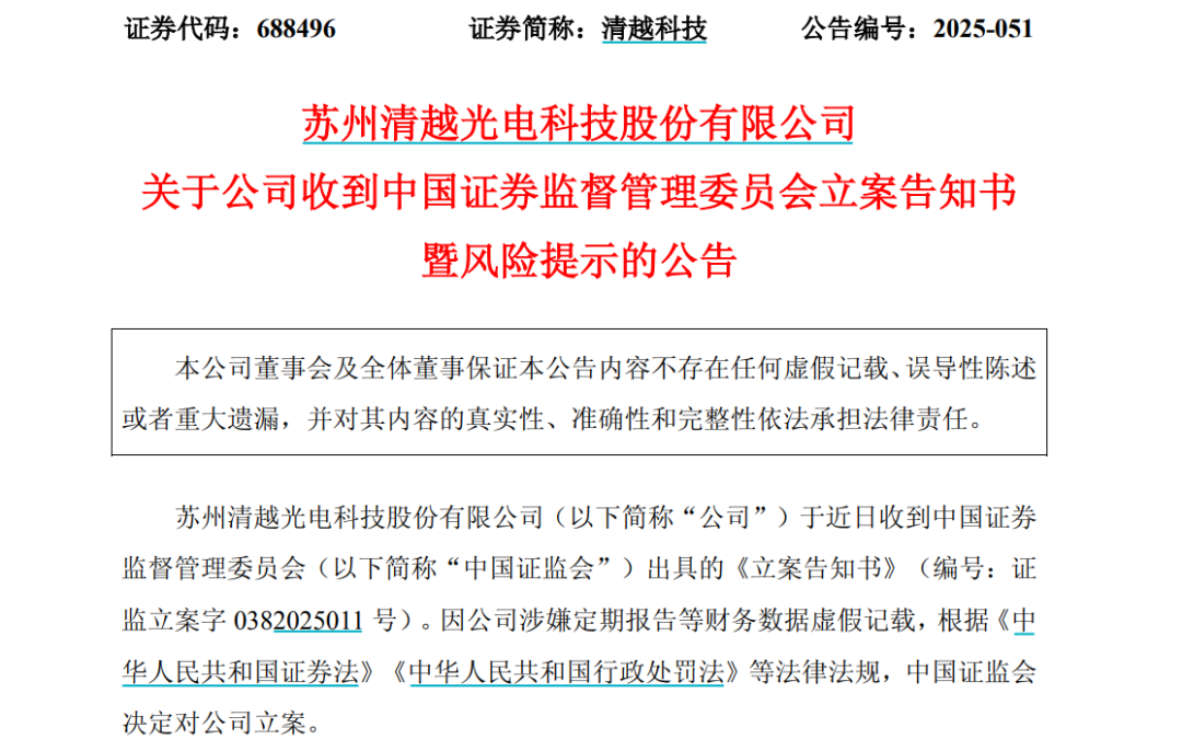 涉嫌定期报告等财务数据虚假记载 清越科技被证监会立案!