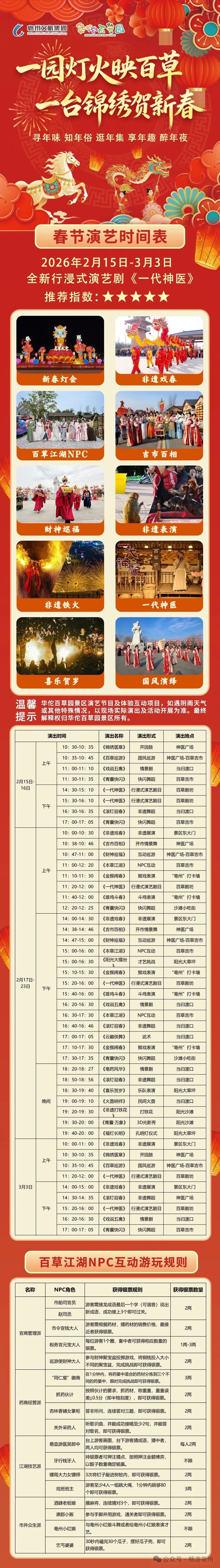 亳州景区春节活动概览 - 亳州多个景区在2026年春节期间(主要集中在2月14日至3月4日)联合推出以“欢欢喜喜过大年”为主题的大型综合性文旅活动[1] - 活动内容极其丰富多元 涵盖非遗民俗表演、大马戏、豫剧展演、风车节、情景剧、机器人表演、光影秀、新春灯会、NPC互动、新春集市等多种类型[1][4][5][6][7][9][11][12][17][18][19] - 活动覆盖华佗百草园、林拥城(含萌宠乐园、山海神兽园、蜗牛庄园等)、国防教育基地、花戏楼、曹操地下运兵道、华祖庵等多个主要景区和景点[1][17][22][25] 华佗百草园景区活动详情 - 核心演艺项目为全新行浸式演艺剧《一代神医》 每日有多场演出 推荐指数为五星[3][13][14] - 活动时间从2月15日持续至3月3日 每日安排密集 例如2月15日至16日上午有《锦绣医草》鼓乐、《青雯快闪》舞蹈、《百草巡游》、《戏说五禽》情景剧等 下午及晚间有《一代神医》剧目、《滚灯迎春》非遗舞蹈、《非遗打铁花》、《青蔓·万象》3D光影秀等[13][14] - 设计了深度互动体验项目“百草江湖NPC” 游客可通过与四大派系(官商管理派、药商经营派、江湖技艺派、市井众生派)的NPC完成各类挑战游戏获取“银票” 游戏形式包括成语接龙、猜药材价格、套圈、分拣药材、听歌识曲、押注博弈、跳大绳等[15] 林拥城景区活动详情 - 林拥城景区内多个子园区同步举办特色活动 萌宠乐园在2月14日至3月3日举办风车节并设有国风快闪巡游及全天候萌宠互动[17][21] - 山海神兽园在2月17日至23日举办“山海神兽园闹新春”活动 每日安排7场瑞兽巡游快闪 并设有古典舞演出、恐龙快闪及知识问答[17][21] - 蜗牛庄园在2月8日至3月2日每天举办4-5场新春大马戏表演 每场约40分钟 节目包括熊大跳绳、雄狮过天桥、高空吊环等 同时在2月17日至23日举办新春游园会 包含主题巡游互动[17][18][21] - 金桂山舞台在2月17日至20日有豫剧表演 欧风园在2月17日至21日有“向爱出鸡”活动及新春乐迷会[21] - 一号门美食小径至主游服务中心区域在2月17日至23日每日有NPC财神快闪舞蹈、民俗演出(如舞龙、划旱船、高跷)及NPC互动演出[20][21] 国防教育基地活动详情 - 国防教育基地在2月17日至23日于导弹广场举办“强国护家”主题活动 包括红歌接龙挑战[22] - 同期设有打卡活动 游客需在全园5个指定点位拍摄与雕塑合影并了解淮海战役历史[23] 花戏楼、曹操运兵道、华祖庵活动详情 - 花戏楼景区在2月17日至23日安排日间及夜游活动 日间有机器人民俗巡游、新春快闪、《白蛇传》演出、非遗小剧场、《钱庄风云》剧目等 夜游核心项目为大型行浸式演出“一台大戏·天下亳商” 推荐指数五星[27][28] - 曹操地下运兵道景区同期推出系列情景剧目 包括推荐指数五星的《老曹的运兵道》、《魏王的宴》、《消失的曹操》 以及互动活动“七步成‘市’”、“谯郡英雄榜”等[27][30] - 华祖庵景区同期活动包括华佗巡游、推荐指数五星的《青囊迷踪》情景剧、岁始华祖祈福、非遗五禽戏教学 并提供新春养生粥和元福寿茶[27][32][33]