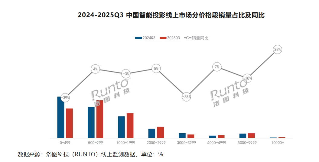 万元以上超高端市场的销量占比从2024年第三季度的0.6%增长至2025年第三季度的0.9%,销量同比涨幅则为33%。 【环球网科技综合报道】10月27日消息,根据洛图科技(RUNTO)最新报告,2025年第三季度,中国智能投影市场(不含激光电视)销量为112.4万 台,同比下降11.5%;销额为16.9亿元,同比下滑10.6%。 洛图科技(RUNTO)表示,从厂商来看,以极米、坚果、当贝、Vidda等为代表的国产投影头部品牌,不约而同地选择了以"技术升维"和"体验升 级"为核心的高端化破局路径。 根据洛图科技(RUNTO)线上监测数据显示,2025年第三季度,5000元以上价格段市场份额为5.0%,同比上涨了0.5个百分点。 此外,500-999元反超500元以下成为占比最高的价格段,销量同比上涨4%,大眼橙、哈趣等品牌贡献较大。2000-2999元价格段市场得益于极米、当 贝等品牌高性价比机型的畅销,销量上涨5%;4000-4999元价格段随着Vidda、坚果、小米等新品的上量,也实现了7%的同比上涨。 (思瀚) ...