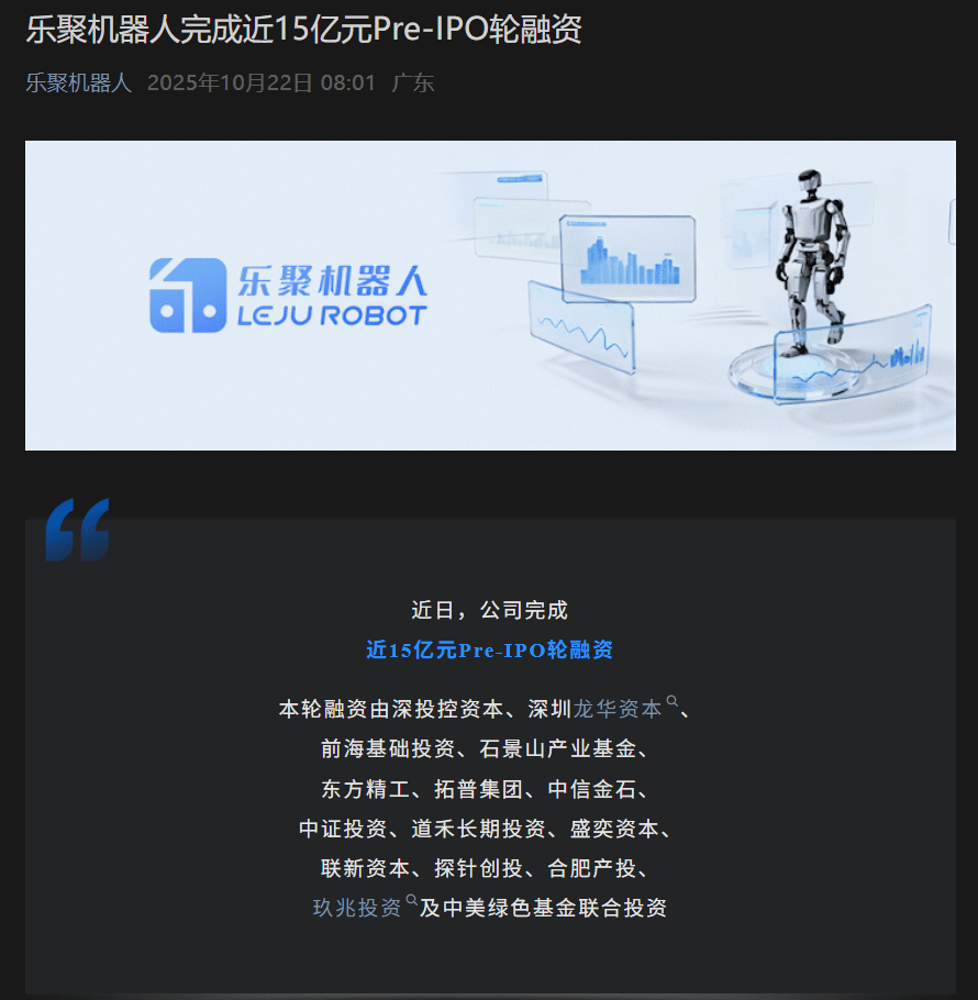 欢迎关注具身智能大讲堂 2025年10月22日,总部位于深圳的乐聚机器人对外宣布,已完成近15亿元 Pre-IPO 轮融资,IT桔子显示,本轮融资后乐聚机器人估值已达90亿元。本轮融 资由深投控资本、深圳龙华资本、前海基础投资、石景山产业基金、东方精工、拓普集团、中信金石、中证投资、道禾长期投资、盛奕资本、联新资本、 探针创投、合肥产投、玖兆投资及中美绿色基金共15家机构联合投资。 据乐聚机器人披露,本轮所融资金将全部投入三大方向:一是强化核心技术研发,二是深化产业链布局,三是完善产业场景应用,最终目标为推动其人形 机器人业务迈向大规模量产与多元化场景应用新阶段。 公开信息显示,乐聚机器人成立于2016年3月,是国家级专精特新 "小巨人"企业,长期聚焦智能机器人研发与生产。在此次Pre-IPO轮融资前,该公司已获 得腾讯、深创投、洪泰基金等机构的战略投资。有知情人士透露,乐聚机器人目前已完成股份制改造,IPO计划正处于推进阶段。 1►攻坚大小脑协同 坚持MBC+RL技术路线 2025 年以来,乐聚机器人旗下 "夸父" 人形机器人在世界机器人大会(WRC2025)、中国国际数字经济博览会等多个展会密集亮相,夸父 ...