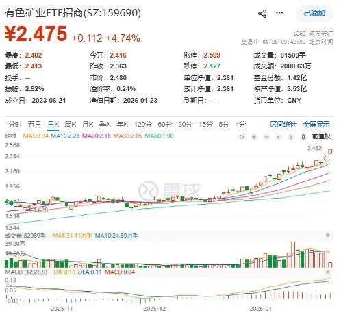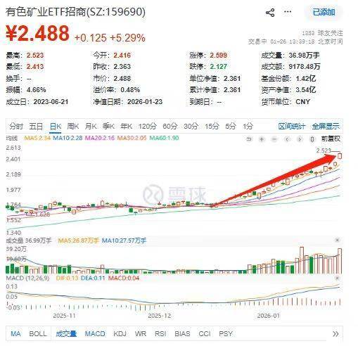 第二,能源与AI新基建拉动。 铜、铝等基本金属的需求逻辑正发生历史性转变。从传统依赖地产,转 向由全球电网改造、数据中心建设和新能源革命驱动的结构性增长。而铜矿品位下降及主要产区频发的 供应扰动,进一步加剧了供需矛盾。 第三,大国博弈的战略储备竞赛。 中美在关键矿产领域的竞争白热化,双方均致力于打造独立、安全 的供应链。美国近期大力推动价值数十亿美元的战略矿产储备法案,直接针对稀土、钨等中国占据主导 地位的资源,这种战略囤货行为显著加剧了市场对未来供应的焦虑,为金属价格提供了长期的政策支 撑。 综上,有色矿业ETF招商(159690) 作为覆盖金、银、铜、铝等核心战略性资源的便捷投资工具,其 高达57%的权重集中于三大品种,使其在当前供给受限、需求爆发、战略竞争加剧的宏观环境中,成为 资金直接布局全球资源价值的有效放大器。 分析指出,有色强势,其背后驱动逻辑在于三大维度的强共振。 第一,宏观信用格局重塑。 美元信用体系面临挑战,推动了全球央行的持续购金潮,显著减少了市场 黄金流通量,直接强化了贵金属的货币属性与价值。与此同时,白银则受益于货币属性与光伏、AI电 子等新工业需求的双重提振。 1月26日,有色大幅 ...
