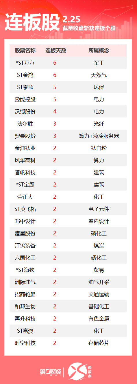 A股市场连板股表现 - 2月25日A股市场共计101只个股涨停,其中多只个股实现连续涨停[1] - 截至收盘,市场出现多只连板个股,连板天数从2天至6天不等[1] 电力板块领涨个股 - 电力板块表现强势,豫能控股实现5连板[1] - 汉缆股份同样属于电力板块,实现4连板[1] 其他板块连板股情况 - *ST万方与RI 25均实现6连板,分别属于军工和天然气概念[1] - ST京蓝实现5连板,属于环保概念[1] - 法尔胜实现3连板,属于光纤概念[1] - 罗曼股份实现3连板,属于算力及液冷服务器概念[1] - 多只个股实现2连板,涵盖钛白粉、算力、建筑、化工、电子元件、室内设计、磷化工、煤炭、贸易、油气开采、交通运输、基础化工、有色金属、存储芯片等多个概念板块[1][2]
