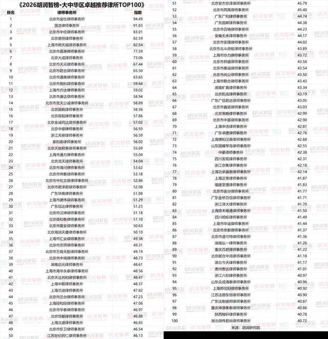 榜单核心信息 - 胡润研究院首次发布法律行业榜单《2026胡润智榜·大中华区卓越推荐律所TOP100》[1] - 北京市金杜律师事务所位列榜首,承接40家沪深300成分股企业法律顾问项目,相关企业总市值达17万亿元[1] - 国浩律师事务所和北京市中伦律师事务所分别排名第二和第三[1] 上榜律所整体情况 - 100家上榜机构平均拥有1424名执业律师,业务覆盖12个核心城市[1] - 上榜律所承办的沪深300成分股企业法律顾问业务,相关企业累计市值近60万亿元[1] 评选维度与方法 - 评选基于三大维度:专业服务力(如IPO、上市公司法律顾问、复杂交易项目)、服务保障力(如规模、服务地域)以及客户满意度[1] - 榜单旨在从企业客户视角评估律所服务头部企业、处理复杂商业项目的综合实力[1] 律所地域分布 - 北京上榜律所数量最多,达50家,凸显其作为政治、文化、国际交往与科技创新中心的地位[1] - 上海以19家上榜律所位列第二,深圳和杭州分别有5家和4家[1]