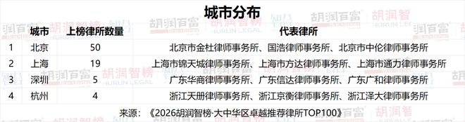 《中国经营报》记者注意到,在日前发布的《2026胡润智榜·大中华区卓越推荐律所TOP100》榜单中, 承办沪深300成份股企业法律顾问业务的律所,服务相关企业的累计市值已近60万亿元人民币。 中经记者 杨让晨 上海报道 | | | | 城市分布 第日报直播 日日 | | --- | --- | --- | --- | | | 城市 上榜律所数量 | | 代表律所 | | | 北京 | 50 | 北京市金杜律师事务所、国浩律师事务所、北京市中伦律师事务所 | | 2 | 上海 | 19 | 上海市锦天城律师事务所、上海市方达律师事务所、上海市通力律师事务所 | | 3 | 深圳 可目 | | 广东华商律师事务所、广东信达律师事务所、广东广和律师事务所 | | 4 | 杭州 | 4 | 浙江天册律师事务所、浙江京衡律师事务所、浙江泽大律师事务所 | | | (1) == (1) (1) == (1 | | 来源:《2026胡润智榜·大中华区卓越推荐律所TOP100》 | (北上深杭成为上榜律所最多的城市。胡润研究院/图) 据司法部数据,截至2025年9月,我国律师事务所达4.5万家,律师达83万人。同时,今年资本 ...