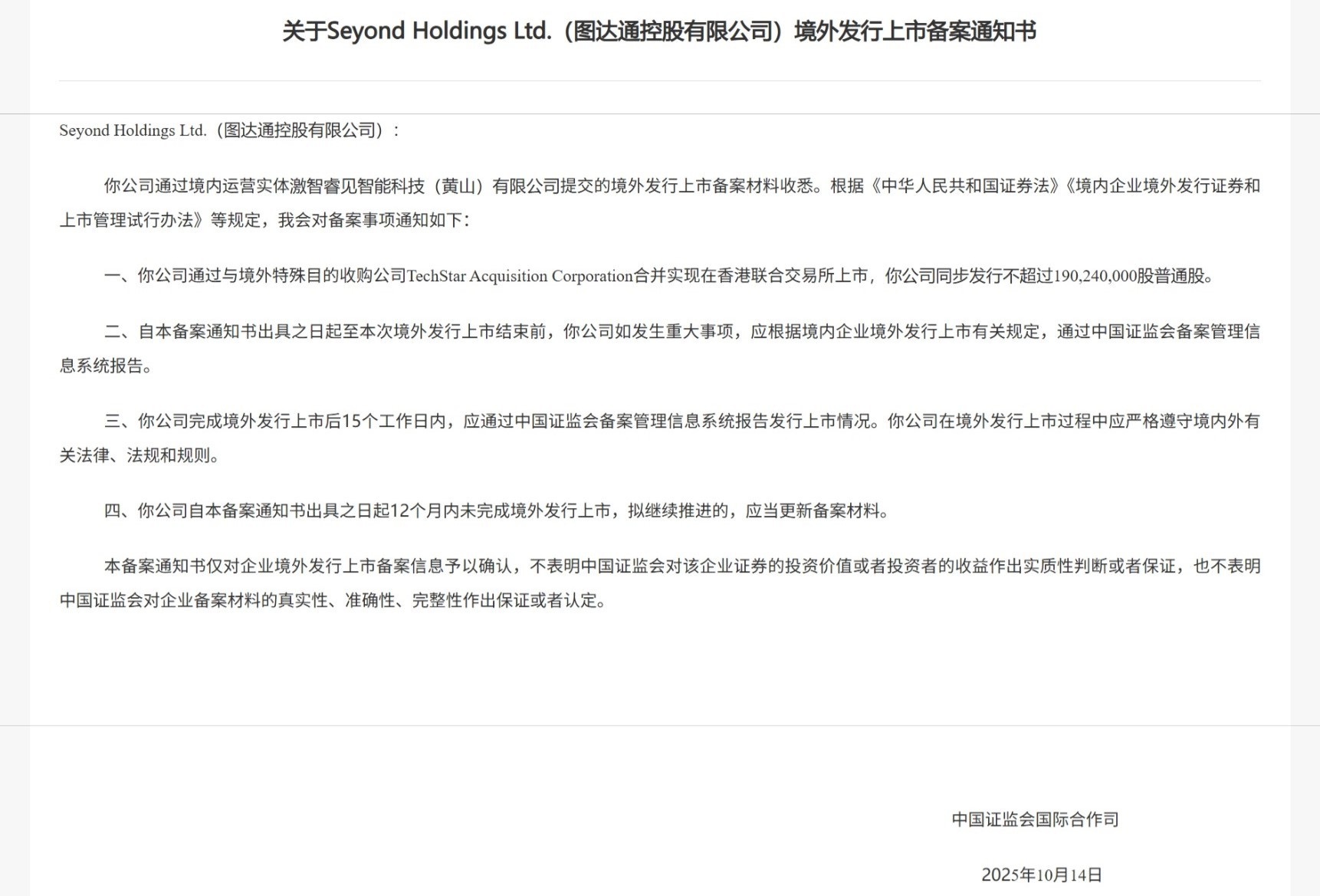 智通财经APP获悉,10月14日,中国证监会国际合作司发布《关于Seyond Holdings Ltd.(图达通控股有限 公司)境外发行上市备案通知书》。公司通过与境外特殊目的收购公司TechStar Acquisition Corporation合 并实现在香港联合交易所上市,拟同步发行不超过190,240,000股境外上市普通股。 招股书显示,图达通是设计、开发及生产车规级激光雷达解决方案的全球领导者。作为全球图像级激光 雷达解决方案提供商,图达通2024年交付约23万台车规级激光雷达,并且于往绩记录期间,ADAS激光 雷达累计销售收入全球排名第二,中国市场份额20.7%。 从车载到机器人,公司持续优化客户结构。在乘用车领域,图达通进一步深化与蔚来的合作,已在蔚来 九款车型上使用,其猎鹰系列累计交付超50万台,商业化落地成果亮眼;在商用车与物流领域,图达通 与Deepway深向、陕汽重卡、赢彻科技、Pony AI等达成稳定合作,持续拓展应用场景;机器人赛道作 为激光雷达应用的蓝海市场,图达通也已切入核心场景,获得九识智能、中立股份、库萨科技、驭势科 技等头部企业的大规模订单,覆盖物流、环卫、搬运等领域。 ...