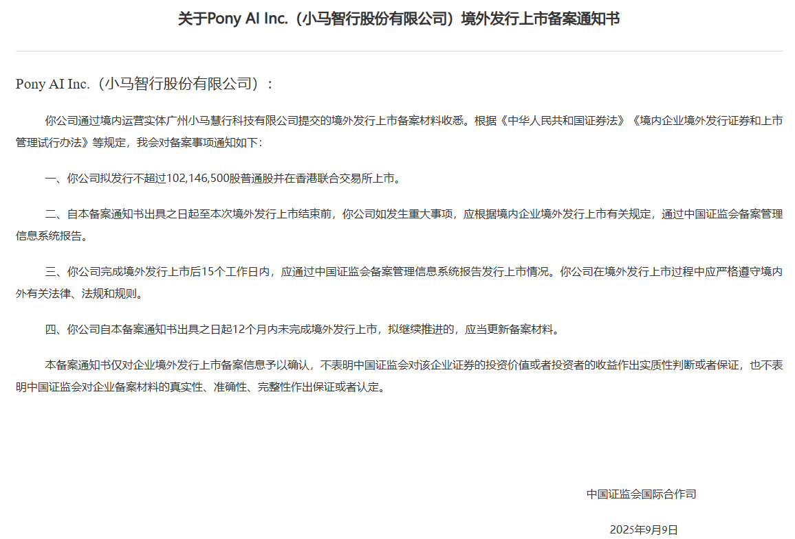 10月14日,中国证监会对小马智行、文远知行、遇见小面、轻松健康、图达通境内企业境外发行上市予以确认,5家均为赴港上市企业。其中。前2家已于去 年在美股上市。 1、小马智行 拟发行不超过102,146,500股普通股并在香港联合交易所上市。 目前,港交所尚无法查询到该公司招股书信息。此前已有消息称小马智行以秘交方式向港交所递交上市申请。根据公开信息,该公司已于2024年11月27日在 纳斯达克上市,募集资金2.6亿美元。截至当地时间2025年10月14日收盘,该公司每股报21.03美元,较发行价上涨61.77%,总市值74.72亿美元。 小马智行总部位于广州,是一家无人驾驶出租车和无人驾驶卡车自动驾驶车辆系统开发商,通过与广汽丰田、上汽在内的厂商合作开发自动驾驶出租车。 2、文远知行 拟发行不超过102,428,200股境外上市普通股并在香港联合交易所上市。 财务方面,2025上半年,小马智行营收3543万美元,净亏损9609万美元。 目前,港交所尚无法查询到该公司招股书信息。此前已有消息称文远知行以秘交方式向港交所递交上市申请。公开信息显示,该公司已于2024年10月25日在 纳斯达克上市,募集资金1.2亿 ...