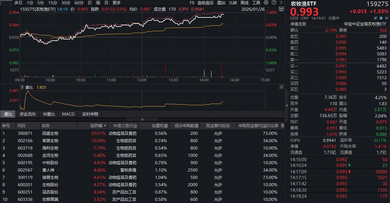 农牧渔板块今日(1月26日)强势上攻,全市场唯一农牧渔ETF(159275)开盘短暂于水面附近震荡后迅速拉升,截至发稿,场内价格涨1.53%,一举收复5 日线、10日线、20日线等3根均线。 成份股方面,动保、畜牧养殖等板块部分个股涨幅居前。截至发稿,回盛生物20CM涨停,莱茵生物涨停,海利生物大涨超7%,金河生物、中牧股份、唐人 神等亦涨幅居前。 | | | | 多日 1分 5分 15分 30分 60分 日 周 月 更多 | | | | | | | | F9 盘前盤后 叠加 九转 画线 工具 (2) | | 农牧渔ETF | | | --- | --- | --- | --- | --- | --- | --- | --- | --- | --- | --- | --- | --- | --- | --- | | 0.004 | | | | | 159275[农牧渔ETF] 14:19 价 0.993 涨跌 0.015(1.53%) 均价 0.987 成交量 170 IOPV 0.9941 | | | | | | | 2026/01/26 .6696 | 01995 | | | | | | | | | | ...