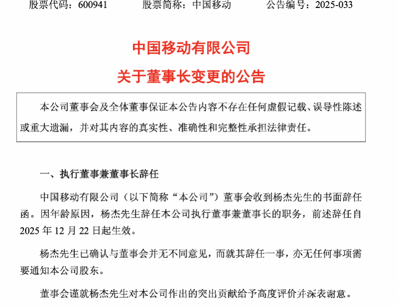 12月23日,南都湾财社记者获悉,中国移动发布公告,杨杰因年龄原因辞任公司执行董事兼董事长的职务,自 2025年12月22日起生效。 中国移动表示,本公司于2025年12月19日向全体董事发出了召开 2025年第十次董事会的会议通知及议案,并于 2025年12月22日以书面决议方式召开了会议,本次会议应参与表决董事7人,实际参与表决董事7人。会议以7票同 意,0票反对,0票弃权的表决结果审议通过了《关于董事会成员调整的议案》 。经本公司提名委员会提议, 董事 会审议及批准, 陈忠岳先生已获委任为本公司的执行董事兼董事长,自2025年12月22日起生效。 南都湾财社记者注意到,关于这一人事变动也是今年以来业内一直热议的话题,因为中国移动原董事长杨杰到今 年7月就满63岁。根据相关规定,央企集团董事长一般都是63岁换人。 10月28日,中国移动通信集团有限公司召开中层以上管理人员大会。中央组织部有关负责同志宣布了党中央关于 中国移动通信集团有限公司主要负责同志调整的决定:陈忠岳同志任中国移动通信集团有限公司董事长、党组书 记,免去其中国联合网络通信集团有限公司董事长、党组书记职务;免去杨杰同志的中国移动通信集团有 ...
