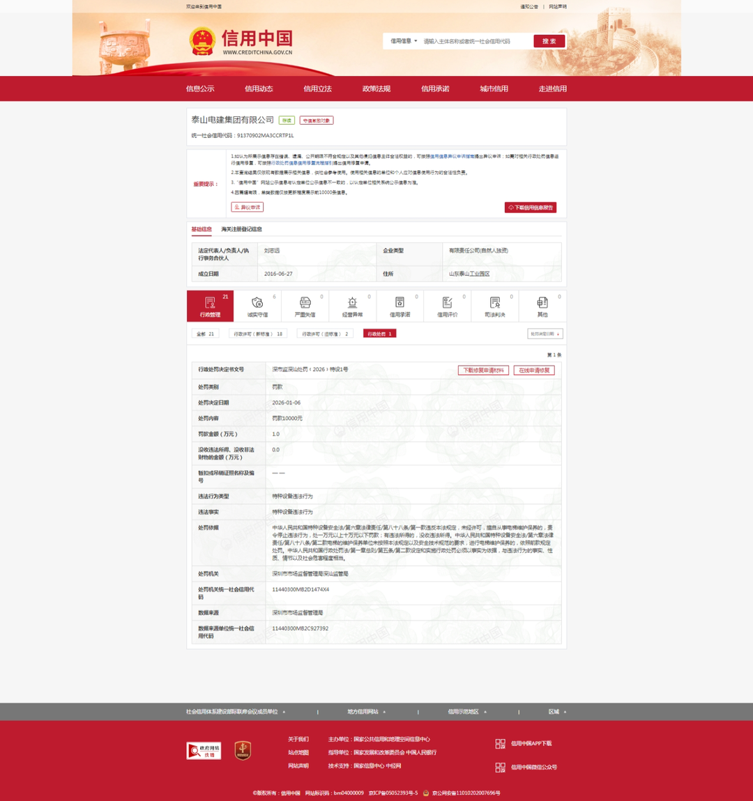内容显示,泰山电建集团的违法事实为"特种设备违法行为"。对此,处罚机关依据《中华人民共和国特种设备安全法》《中华人民共和国行政处罚法》等 相关规定,对泰山电建集团处1万元罚款。行政处罚决定书文号:深市监深汕处罚﹝2026﹞特设1号。 齐鲁晚报·齐鲁壹点记者于信用中国行政处罚栏获悉,泰山电建集团有限公司(下称"泰山电建集团")收到罚单,处罚类别为"罚款",处罚机关是深圳市 市场监督管理局深汕监管局。 据泰山电建集团官方网站介绍,公司致力于电力建设工程总承包、电站机组运行维护检修、机械设计制造等产业的创新和发展。其客户覆盖全国20余个 省、自治区、直辖市,与华润电力、神华集团、华能集团等多家大型发电企业保持长期合作关系,完成了从300MW到1000MW超超临界机组等电站设备 制造、安装、检修运维等电力工程项目。 国家企业信用信息公示系统显示,泰山电建集团有限公司成立于2016年,注册资本16688万元人民币,法定代表人刘志远。 ...