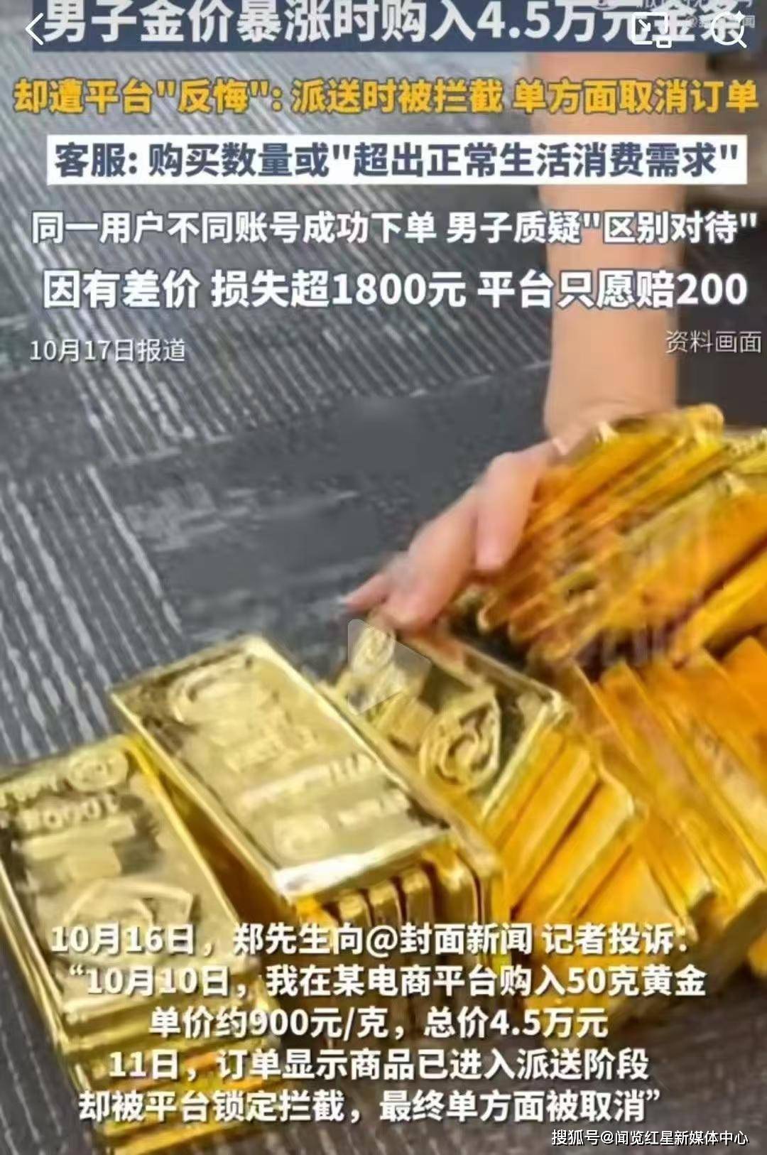 闻览焦点:金价飙升,本是商家与投资者共同关注的市场现象,却成了一面"照妖镜",映照出某些电商平台在利益与契约精神之间的丑陋抉择。消费者郑 先生价值4.5万元的黄金订单在派送途中被平台单方面拦截取消,甚至购买记录都被删除,而平台最终仅以200元赔偿试图了事,这番操作,无异于对消费 者权益的一次"精准狙击"。 3. 赔偿方案显失公平: 从4.5万元的订单到200元的赔偿,这巨大的落差本身就充满了讽刺意味。这区区200元,不仅无法弥补消费者因金价上涨而错失的 潜在收益,更无法抚平其被无端剥夺交易权利的信任创伤。这种赔偿方案,更像是一种对消费者的羞辱,而非诚意的补救。 这一事件暴露出的是一个普遍性问题: 在数字化交易中,平台既是"运动员"又是"裁判员",拥有制定规则、解释规则和执行规则的巨大权力。当市场波 动触及自身利益时,一些平台便会利用这种优势地位,以各种技术性借口(如"系统错误"、"支付异常"、"风控拦截")来单方面否定合同的效力,将商业 风险全部转嫁给消费者。长此以往,损害的不仅是单个消费者的权益,更是整个电商行业的公信力。 首先,平台的解释苍白无力,难以自圆其说。 客服回应称"可能是因为支付异常",这本身就 ...