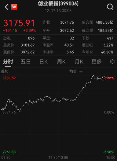 本报(chinatimes.net.cn)记者帅可聪 北京报道 2025年12月17日,A股三大指数平开高走,午后盘中大幅拉升,上证指数收涨逾1%,创业板指大涨超 3%。全市场逾3600只个股收涨,沐曦股份(688802.SH)上市首日股价暴涨693%。 深证成指创近三个月最大涨幅 12月17日,继前一天大幅下挫后,A股三大指数基本平开。早盘时段,上证指数维持弱势震荡,深证成 指、创业板指表现相对较强。午后,三大指数盘中大幅拉升,最终集体收于全天高位。 截至当天收盘,上证指数涨1.19%,报3870.28点;深证成指涨2.4%,报13224.51点;创业板指涨 3.39%,报3175.91点。此外,沪深300指数涨1.83%,北证50指数微跌0.04%,科创50指数涨2.47%。 其中,上证指数创10月21日以来最大单日涨幅,深证成指创9月11日以来最大涨幅,创业板指创10月24 日以来最大涨幅。 A股沪、深、京三市全天总成交额约1.83万亿元,较前一日放量逾860亿元,为连续第三个交易日成交额 不及2万亿元。 盘面上,31个申万一级行业板块多数上涨,仅农林牧渔、国防军工、煤炭板块下跌,跌幅分别为 0.54% ...