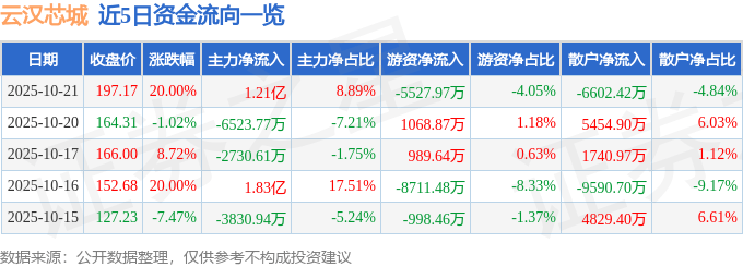 近5日资金流向一览见下表: 证券之星消息,云汉芯城10月21日涨停收盘,收盘价197.17元。该股于14点4分涨停,未打开涨停,截 止收盘封单资金为6047.68万元,占其流通市值2.2%。 今日云汉芯城涨停的可能因素有:1、公司2025年半年报显示营收及净利润同比分别增长9.97%和 21.88%,业绩稳健增长提振市场信心;2、石墨烯散热膜产品在红魔系列终端及荣耀折叠手机项目实现 应用,固态电池封装材料技术储备强化新能源赛道布局;3、创业板IPO成功融资4.4亿元,估值优势及 产业互联网平台优势凸显,B2B商城日可售SKU达2799万,注册用户超69万;4、技术研发投入持续加 码,2024年研发费用4562万元,11项核心技术支撑电子元器件供应链服务能力;5、存储芯片、MCU芯 片等产品线扩展,与极海半导体深化合作满足国产替代需求。 10月21日的资金流向数据方面,主力资金净流入1.21亿元,占总成交额8.89%,游资资金净流出5527.97 万元,占总成交额4.05%,散户资金净流出6602.42万元,占总成交额4.84%。 | | | | 日期 收盘价 涨跌幅 主力净流入 主力净占比 游资净点比 散户净 ...