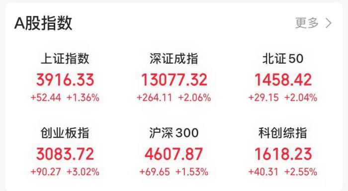 10月20日开盘,A股三大指数集体走高,创业板指涨超3%,深成指涨近2%。 | 上证指数 深证成指 | | 北证50 | | | | --- | --- | --- | --- | --- | | 3861.65 12930.81 | | 1446.22 | | | | +21.90 +0.57% +241.87 +1.91% +13.36 +0.93% | | | | | | 科创50 创业板指 | | 万得全A | | | | 1395.58 3037.53 | | 6186.18 | | | | +32.41 +2.38% +102.16 +3.48% +77.77 +1.27% | | | | | | 沪深300 中证500 | | 中证A500 | | | | 4555.32 7116.64 | | 5458.60 | | | | +41.08 +0.91% +100.57 +1.43% +65.63 +1.22% | | | | | | 中证1000 深证100 | | 中证红利 | | | | 5703.03 7292.22 | | 5562.35 | | | | +106.74 +1.49% ...