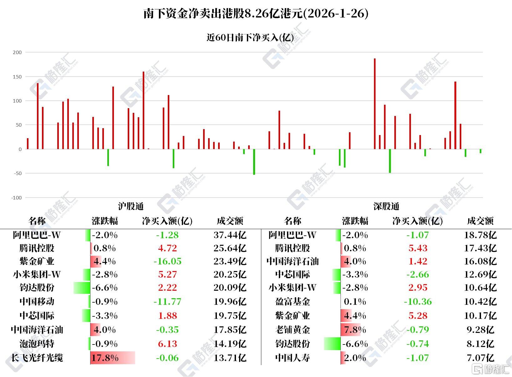 南下资金流向 - 1月26日南下资金净卖出港股8.26亿港元,为连续第二日净卖出 [1] - 当日净买入额最高的个股为腾讯控股10.15亿港元、小米集团-W 8.22亿港元、泡泡玛特6.13亿港元、钧达股份1.47亿港元、中国海洋石油1.07亿港元 [1] - 当日净卖出额最高的个股为中国移动11.77亿港元、紫金矿业10.77亿港元、盈富基金10.36亿港元、阿里巴巴-W 2.35亿港元、中国人寿1.06亿港元 [1] - 南下资金已连续7日净买入小米集团-W,累计净买入38.9621亿港元 [1] - 南下资金已连续4日净买入中国海洋石油,累计净买入10.9627亿港元 [1] - 南下资金已连续3日净买入泡泡玛特,累计净买入17.3397亿港元 [1] - 南下资金已连续16日净卖出中国移动,累计净卖出128.9303亿港元 [1] 个股表现与交易数据 - 腾讯控股股价上涨0.8%,获得南下资金净买入4.72亿港元,成交额为25.64亿港元 [4] - 小米集团-W股价下跌2.8%,获得南下资金净买入5.27亿港元,成交额为20.25亿港元 [4] - 泡泡玛特股价下跌0.9%,获得南下资金净买入6.13亿港元,成交额为14.19亿港元 [4] - 中国海洋石油股价上涨4.0%,南下资金净卖出0.35亿港元,成交额为17.85亿港元 [4] - 钧达股份股价下跌6.6%,获得南下资金净买入2.22亿港元,成交额为20.09亿港元 [4] - 中国移动股价下跌0.9%,遭遇南下资金净卖出11.77亿港元,成交额为19.96亿港元 [4] - 阿里巴巴-W股价下跌2.0%,遭遇南下资金净卖出1.28亿港元,成交额为37.44亿港元 [4] - 长飞光纤光缆股价大幅上涨17.8%,南下资金净卖出0.06亿港元,成交额为13.71亿港元 [4] 机构观点与公司动态 - 海通国际维持腾讯控股“跑赢大市”评级,目标价700港元,预计公司第四季度总收入达1950亿元,同比增长13%,非国际财务报告准则营业利润预计为680亿元,同比增长15% [5] - 海通国际认为腾讯控股高质量增长将在2026财年延续,受高利润新业务线驱动,预计仍可实现小幅利润率扩张 [5] - 小米集团于1月26日以1.404亿港元回购400万股B类股份 [5] - 花旗重申对泡泡玛特的“买入”评级,目标价415港元,预期其在IP多元化、产品创新以及多领域变现能力的突破将支撑2026年的增长动能 [5][6] - 花旗认为市场对泡泡玛特IP生命力与孵化能力的估值仍显不足,非LABUBU系列的重磅新品上市反响热烈,且公司已启动股份回购计划,有望进一步提升投资者信心 [5][6] - 泡泡玛特是花旗在中国消费领域的首选买入标的之一 [6]