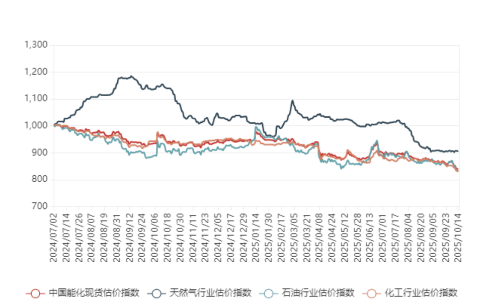 来源:中国金融信息网 新华财经北京10月14日电(郑大伟)截至2025年10月14日,中国能化现货估价指数报 839.25点,较前一工作日(10月13日,下同)下跌 0.61点,跌幅为0.07%,较基期(2024年7月2日)下跌160.75点,跌幅为16.07%。 其中,石油行业估价指数报833.68点,较前一工作日上涨0.99点,涨幅为0.12%。 天然气行业估价指数报906.71点,较前一工作日上涨0.69点,涨幅为0.08%。 化工行业估价指数报829.36点,较前一工作日下跌2.92点,跌幅为0.35%。 今日中国能化现货指数收盘微幅下跌。部分柴油、燃料油随国际原油小幅上涨,化工产品除尿素小幅反弹外几乎全面下跌。橡胶塑料期 货偏弱运行,现货价格跟随回落,下游采购一般。 表为当期中国能化现货监测估价情况 (单位:元/吨,山东、上海、舟山保税船燃单位:美元/吨) | 行业 | 品类 | 详情 | 当期价格 | 上期价格 | | 涨跌 涨跌幅 | | --- | --- | --- | --- | --- | --- | --- | | 石油 | 原油 | 山东港进口到岸价 | 3839 | 3799 | ...