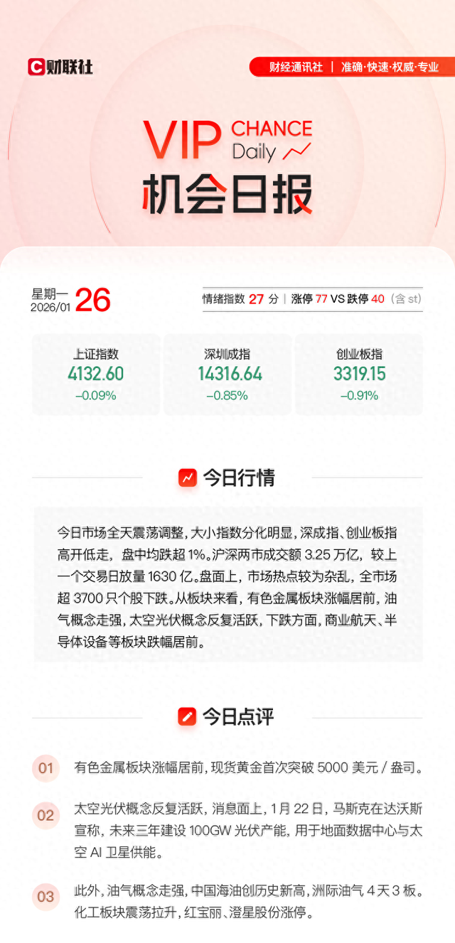 1月26日,上证指数全天窄幅震荡;深证成指、创业板指、科创50指数早盘冲高回落,午后低位窄幅震 荡。截至收盘,上证指数报4132.61点,跌0.09%,成交额14519亿元;深证成指报14316.64点,跌 0.85%,成交额17963.43亿元;创业板指报3319.15点,跌0.91%,成交额8452.11亿元;科创50指数报 1532.80点,跌1.35%,成交额1089亿元。沪深两市合计成交32482.43亿元,成交额较上一交易日增加 1629.76亿元。 盘面上来看,行业板块、概念跌多涨少。其中,贵金属、石油石化、有色金属、保险、煤炭、农林牧渔 等行业涨幅靠前;黄金、病毒防治、小金属、钛白粉、环氧丙烷、猪肉等概念走势活跃。国防军工、房 地产、汽车、电子、计算机、商贸零售、传媒、家电等行业跌幅居前;空间站、北斗导航、卫星互联 网、同步磁阻电机、商业航天、激光雷达、低空经济、航母、存储芯片等概念走势较弱。涨停个股主要 集中在有色金属、医药生物、机械设备、电力设备、计算机等行业。 个股涨跌情况,截至收盘,沪深两市合计1538只个股上涨,3547只个股下跌,平盘个股88只,停牌的个 股10只。不含当日上市新股 ...