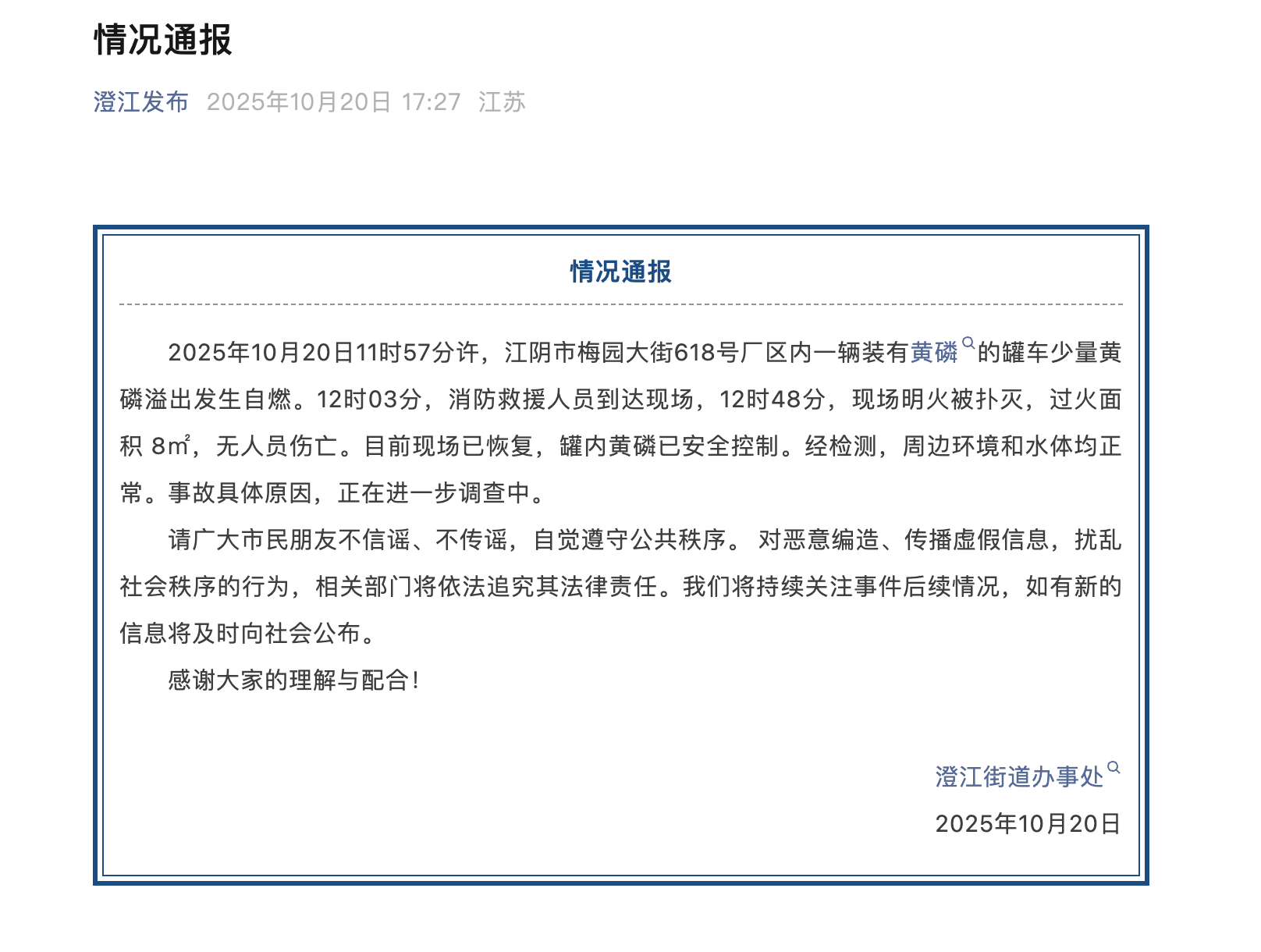 10月20日17时30分左右,澄江街道办事处发布情况通报:10月20日11时57分许,江阴市梅园大街618号厂区内一辆装有黄磷的罐车有少量黄磷溢出发生自 燃。12时03分,消防救援人员到达现场,12时48分,现场明火被扑灭,过火面积8㎡,无人员伤亡。目前现场已恢复,罐内黄磷已安全控制。经检测,周边 环境和水体均正常。 每经记者|温雅兰 每经编辑|文多 10月20日中午,位于无锡江阴梅园大街618号的澄星股份(SH600078,股价9.81元,市值66.40亿元)江阴工厂发生火灾。现场视频显示,厂区内腾起白雾并 伴有巨大火焰。 图片来源:"澄江发布"微信文章截图 当日傍晚,《每日经济新闻》记者以消费者身份致电周边商户,有商户表示,目前该地区已恢复正常生产生活,工厂员工也已回归岗位。 10月21日晚间,澄星股份发布公告称,因火灾事件,10月20日收到无锡市应急管理局出具的《现场处理措施决定书》,目前江阴工厂暂时停产,整改时限至 11月20日。 澄星股份表示,本次公司江阴工厂黄磷自燃事件未造成人员伤亡,未对公司造成较大损失。公司将认真吸取教训,积极落实整改,排查排除生产安全隐患, 争取尽早恢复正常生产,并进一步加强 ...